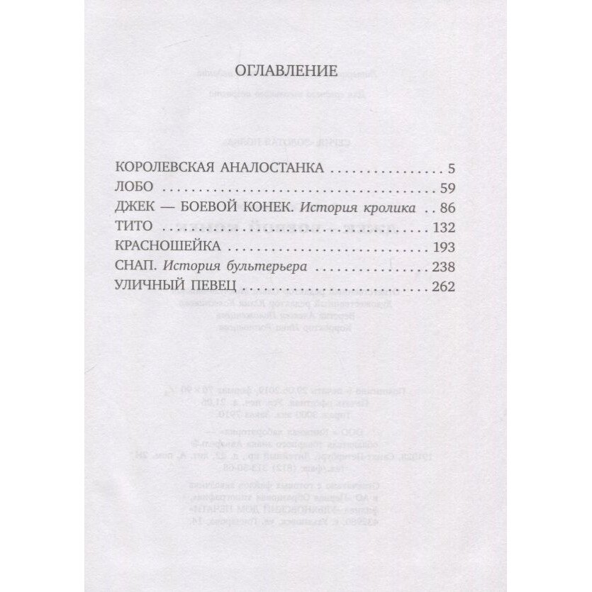 Истории Сетона-Томпсона не оставят равнодушными читателей любого возраста. Сладкоежка медвежонок Джонни, упрямый щенок Чинк, самый быстрый на свете голубь Арно, свободолюбивый мустанг-иноходец, неуловимый черно-бурый лис Домино, сильный и смелый пес Бинго - настоящие животные-герои, которые способны нам, людям, дать уроки доброты и любви.