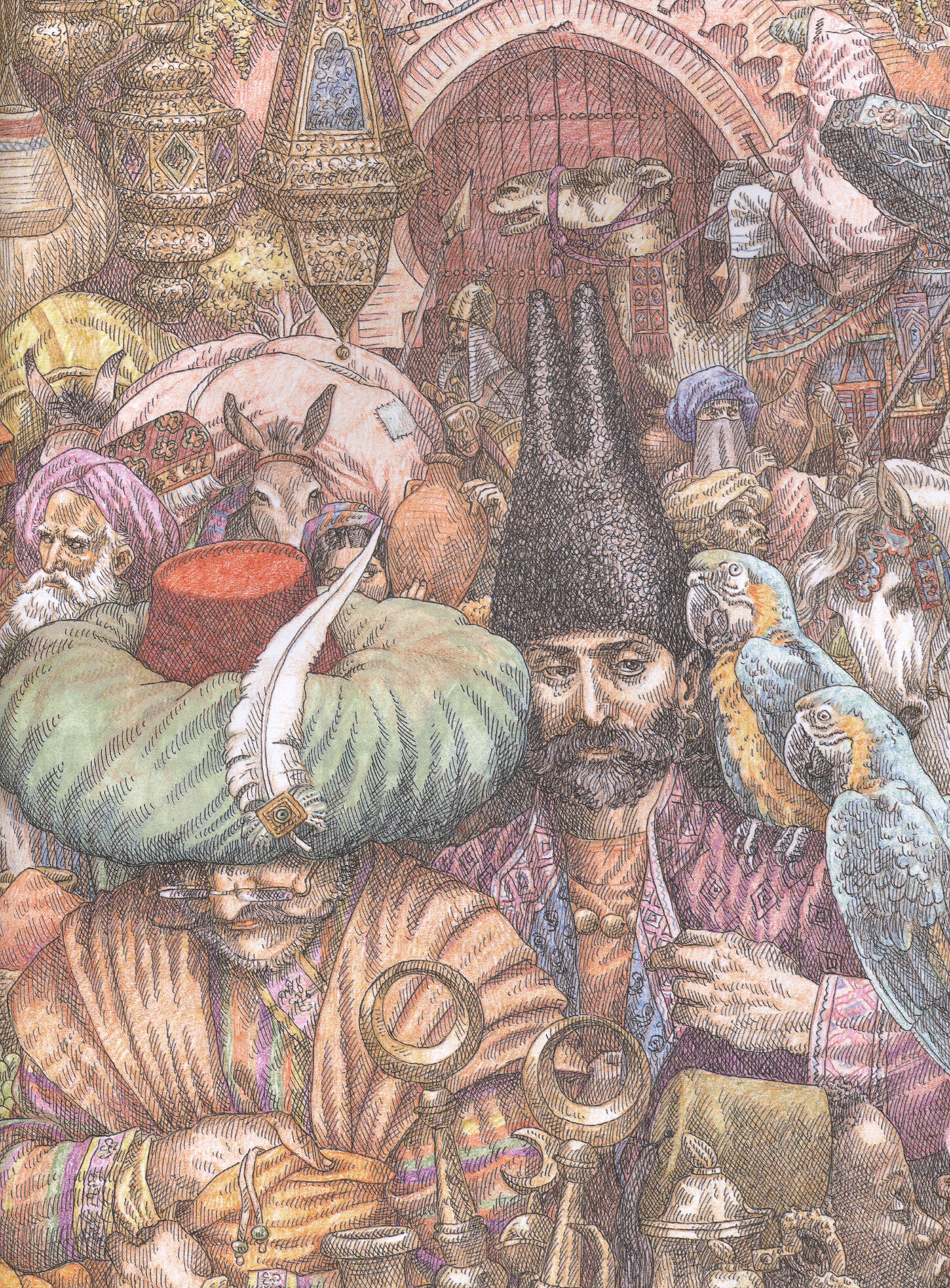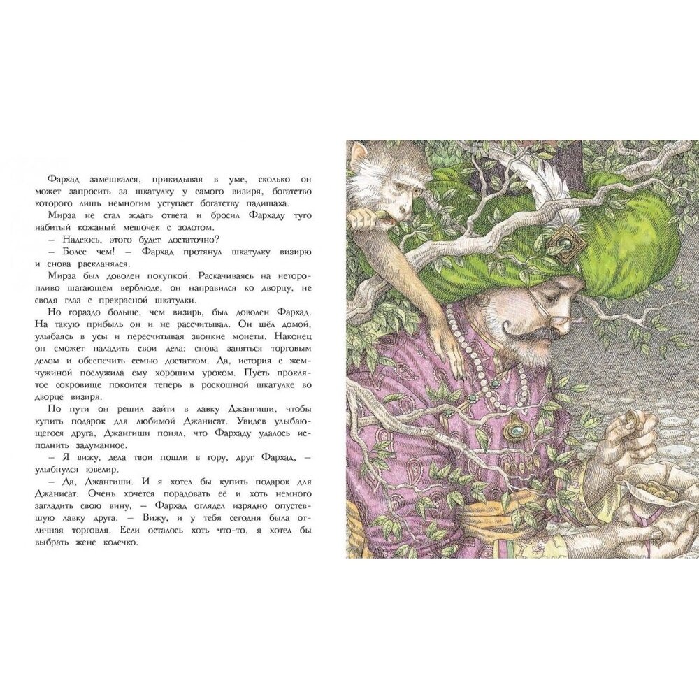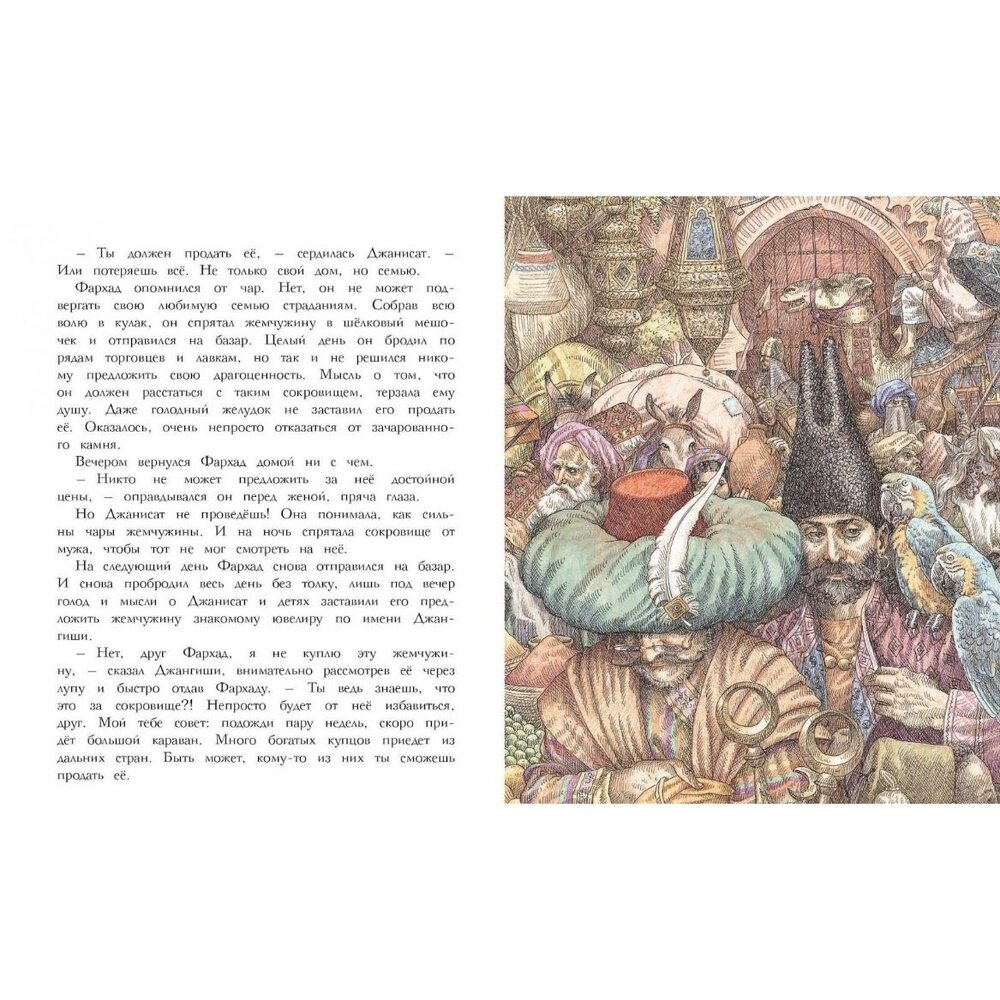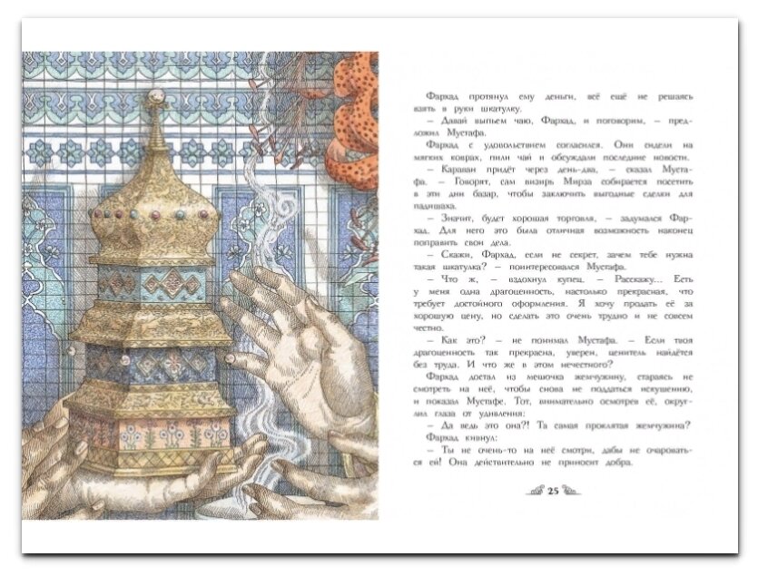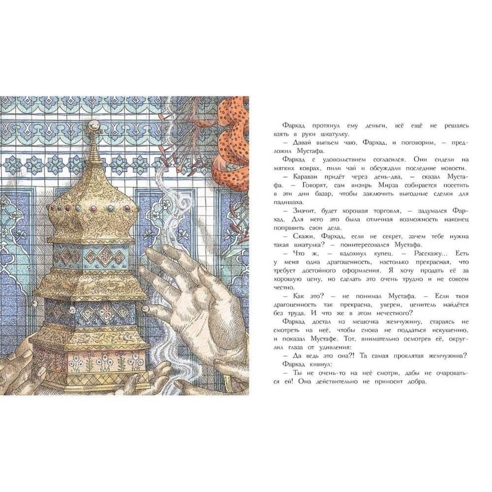 Книга очень понравилась! Рисунки просто очаровательные - прорисовка, богатые и насыщенные цвета и поистине восточная пышность. И история привлекла: читала вслух и слушала вся разновозрастная семья. Сказка такая типично восточная: с кудрявыми описаниями и неспешным сюжетом. Но не очень длинная, хотелось бы подлинней. Рисунки крупные, почти на каждой странице, если не на весь лист, то небольшой рисунок, но есть. Но рисунки некоторые немного повторяются. Шрифт средний - не очень крупный. Отпечатано в Кирове. К качеству претензий никаких нет. Опечаток тоже не заметила. Полная цена несколько завышена для 48 страниц. Рекомендовано с 6 лет.