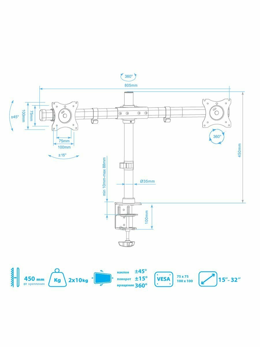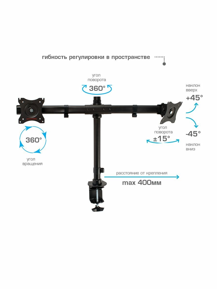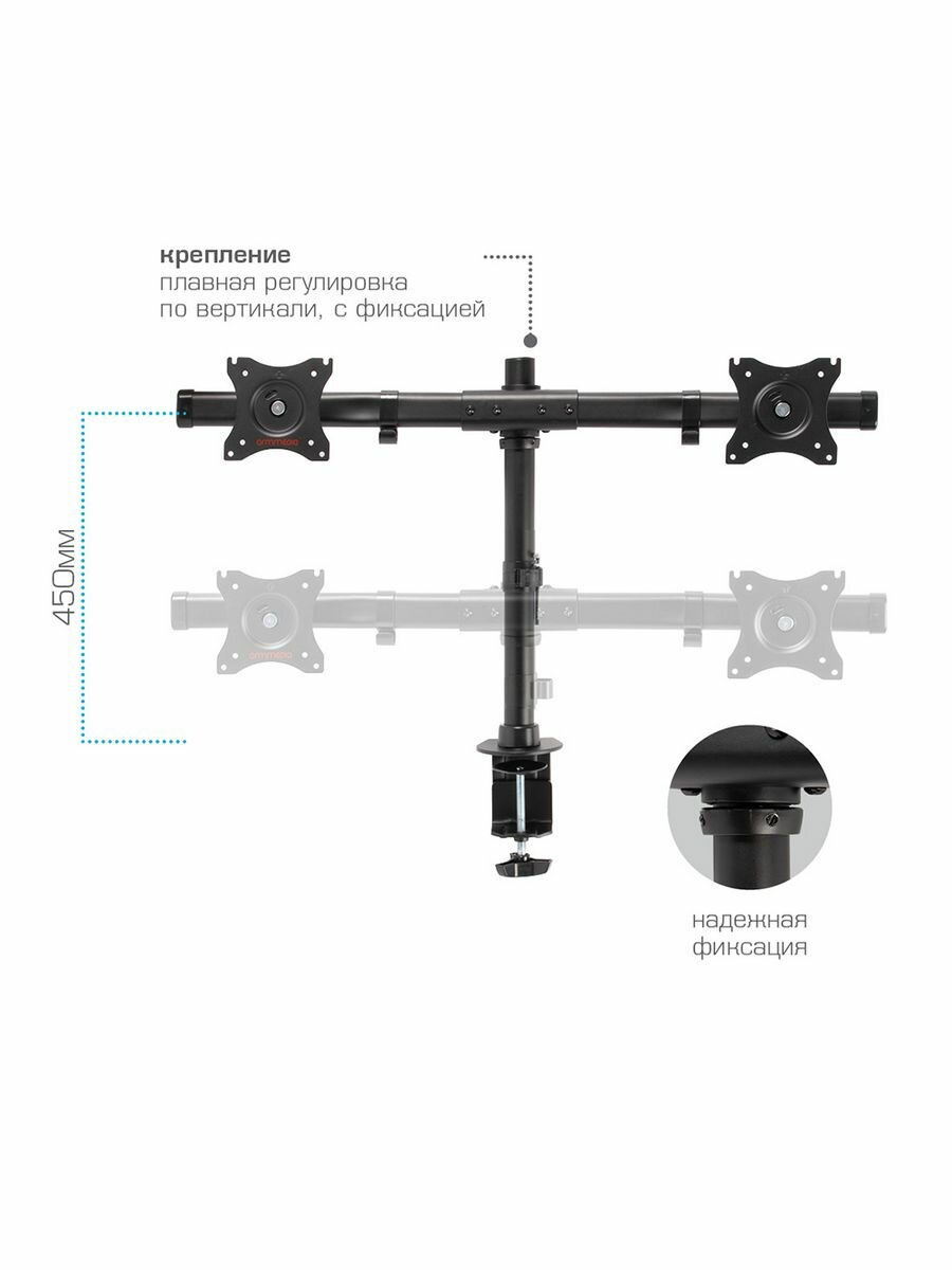 | Дополнительно | Универсальное настольное крепление. ,Надежная стальная конструкция- макс. нагрузка 2x10 кг,Мониторы на кронштейне можно:вращать на 360° в горизонтальной плоскости, наклонять вверх и вниз, и поворачивать влево и вправо. ,Регулируемое по высоте крепление. ,Кабель-канал. ,Два варианта установки на столешницу:за край стола и на поверхность стола. |