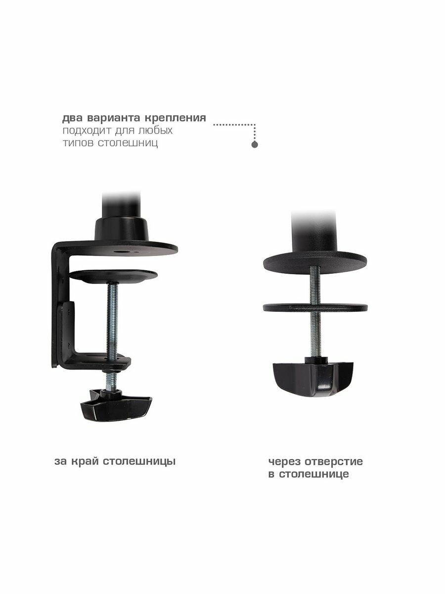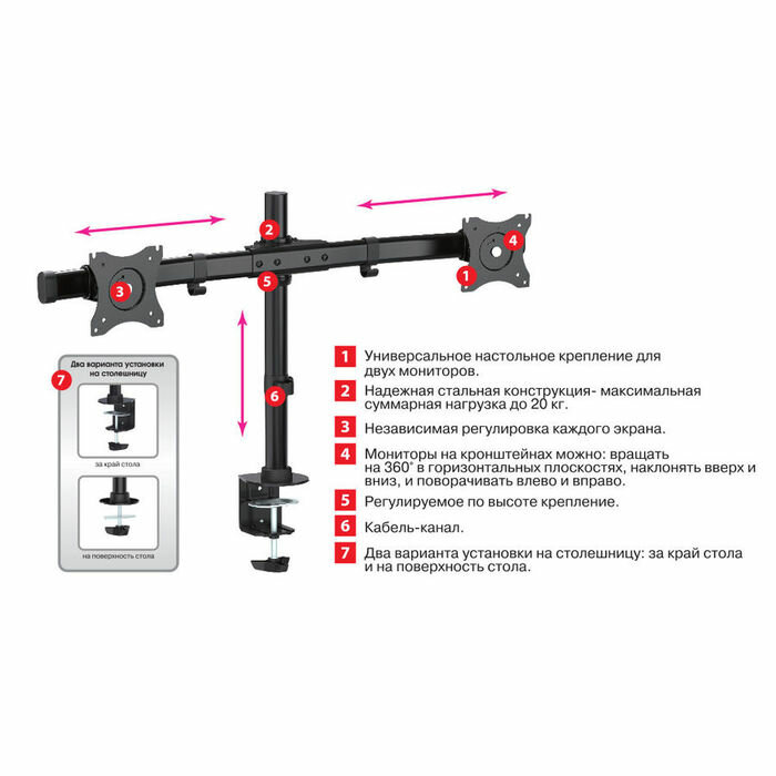 Мониторы на кронштейне можно: вращать на 360° в горизонтальной плоскости, наклонять вверх и вниз, и поворачивать влево и вправо. Кабель-канал. Два варианта установки на столешницу: за край стола и на поверхность стола.