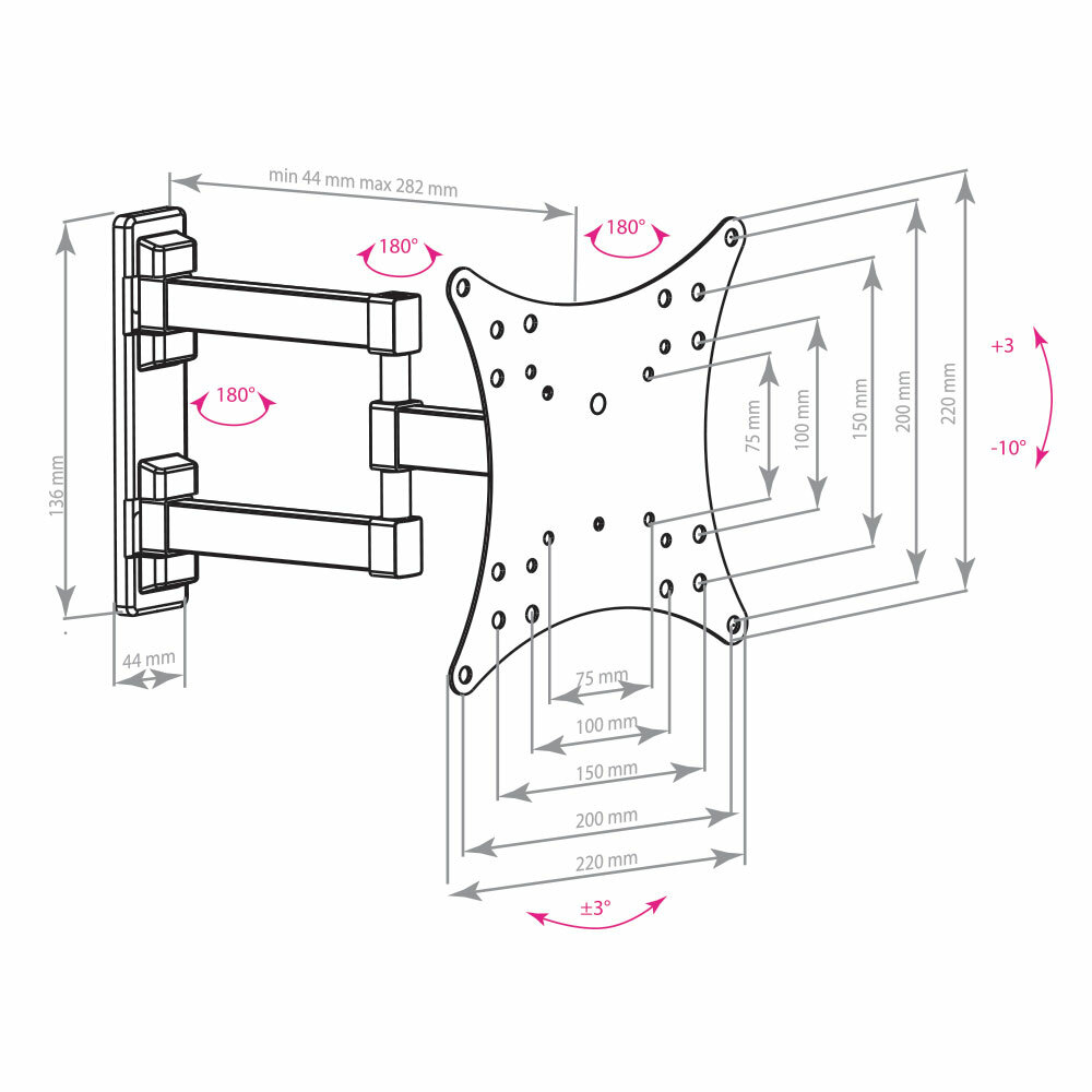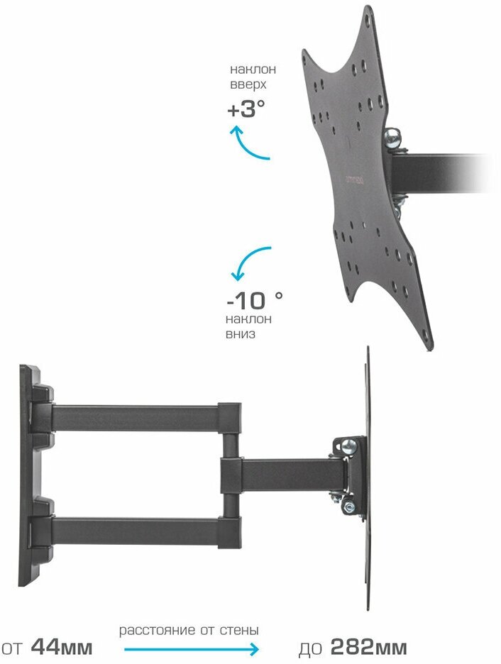 | Дополнительно | надежная стальная конструкция, телевизор на кронштейне можно наклонить, повернуть и сдвинуть к стене, легкий монтаж телевизора благодаря наличию съемной монтажной пластины |