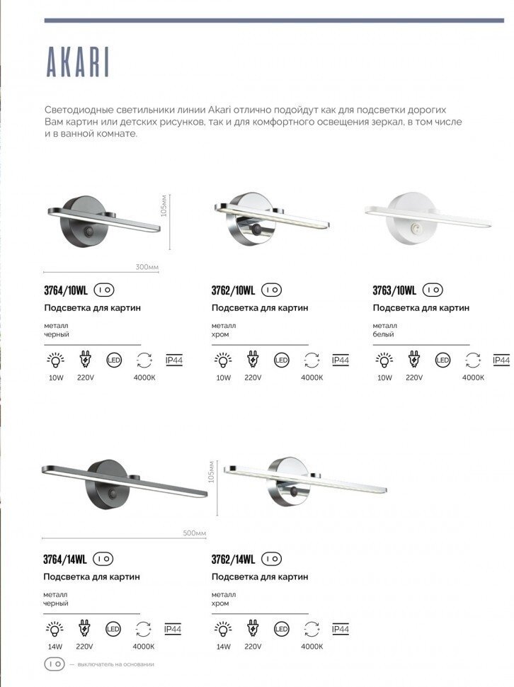 Светодиодные светильники серии AKARI отлично подойдут как для подсветки дорогих Вам картин или детских рисунков, так и для комфортного освещения зеркал, в том числе и в ванной комнате.