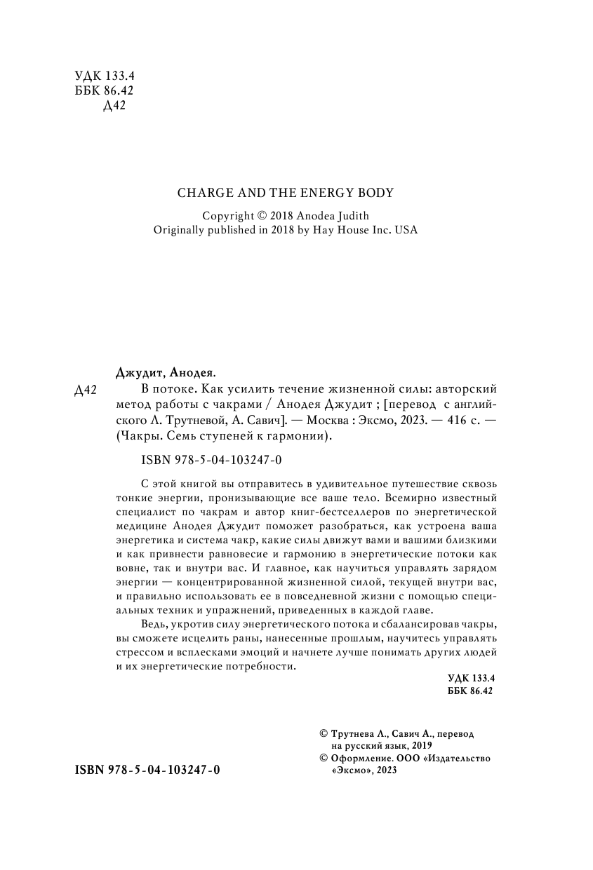 С этой книгой вы отправитесь в удивительное путешествие сквозь тонкие энергии, пронизывающие все ваше тело. Всемирно известный специалист по чакрам и автор книг-бестселлеров по энергетической медицине Анодея Джудит поможет разобраться, как устроена ваша энергетика и система чакр, какие силы движут вами и вашими близкими и как привнести равновесие и гармонию в энергетические потоки, как вовне, так и внутри вас. И главное - как научиться управлять зарядом энергии - концентрированной жизненной силой, текущей внутри вас, и правильно использовать ее в повседневной жизни с помощью специальных техник и упражнений, приведенных в каждой главе.