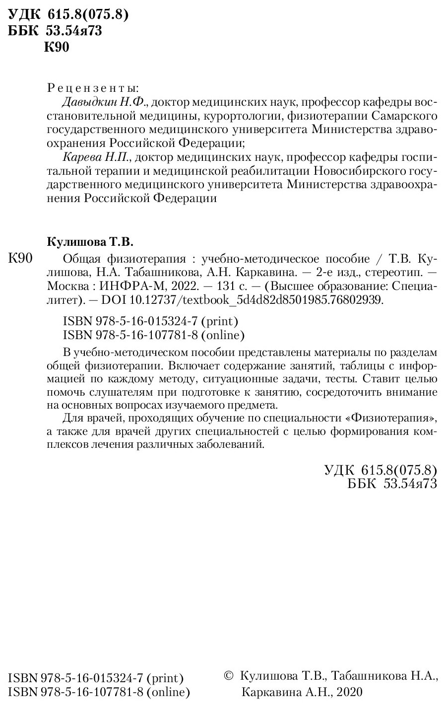 Общая физиотерапия. Учебно-методическое пособие (Кулишова Тамара Викторовна, Табашникова Наталья Александровна, Каркавина Анна Николаевна); Инфра-М, 2024