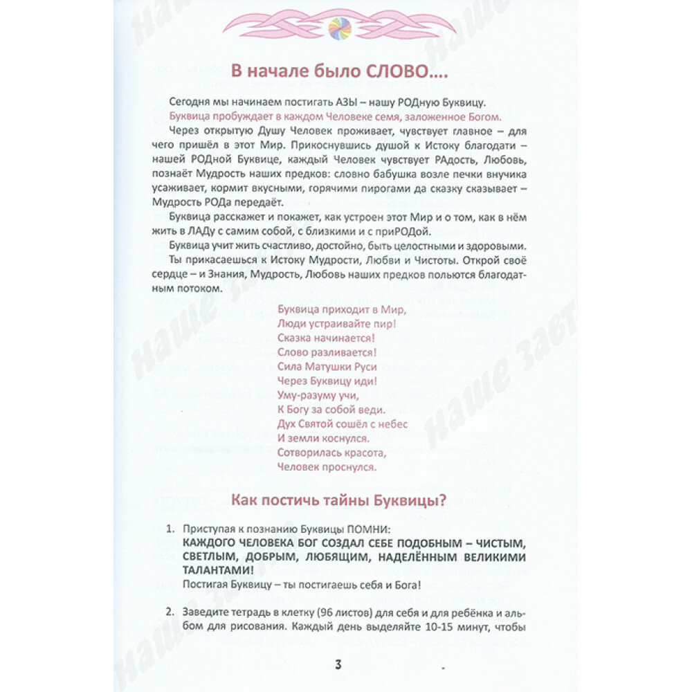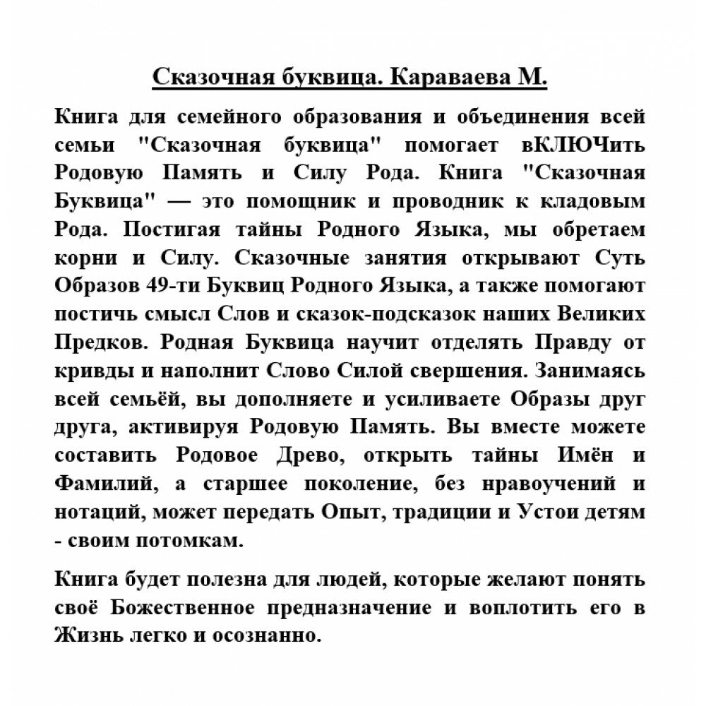 Книга для семейного образования и объединения всей семьи "Сказочная Буквица" помогает вКЛЮЧить Родовую Память и Силу Рода. Книга "Сказочная Буквица" - это помощник и проводник к кладовым Рода. Постигая тайны Родного Языка, мы обретаем корни и Силу. Сказочные занятия открывают Суть Образов 49-ти Буквиц Родного Языка, а также помогают постичь смысл Слов и сказок-подсказок наших Великих Предков. Родная Буквица научит отделять Правду от кривды и наполнит Слово Силой свершения. Занимаясь всей семьёй, вы дополняете и усиливаете Образы друг друга, активируя Родовую Память. Вы вместе можете составить Родовое Древо, открыть тайны Имён и Фамилий, а старшее поколение, без нравоучений и нотаций, может передать Опыт, традиции и Устои детям - своим потомкам.