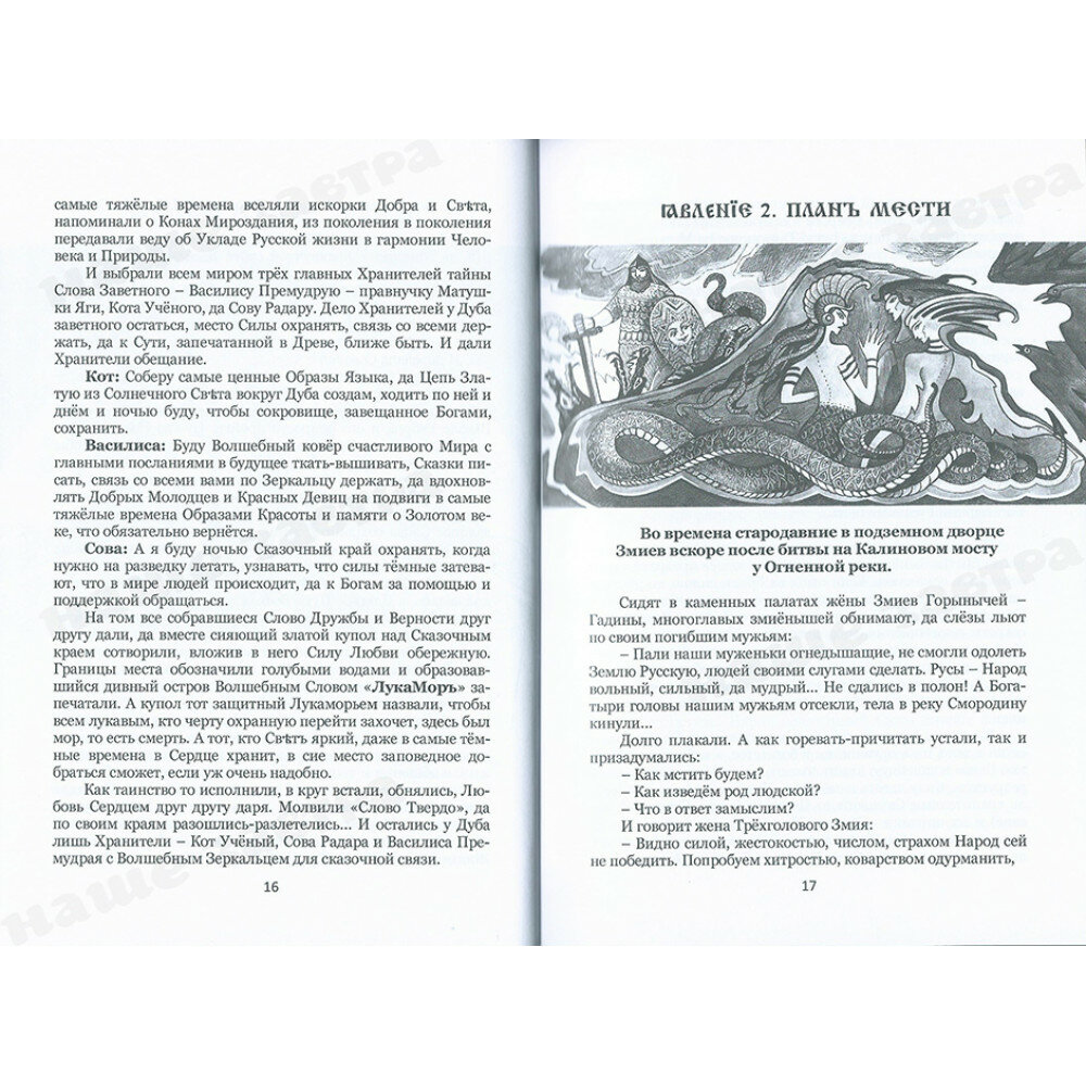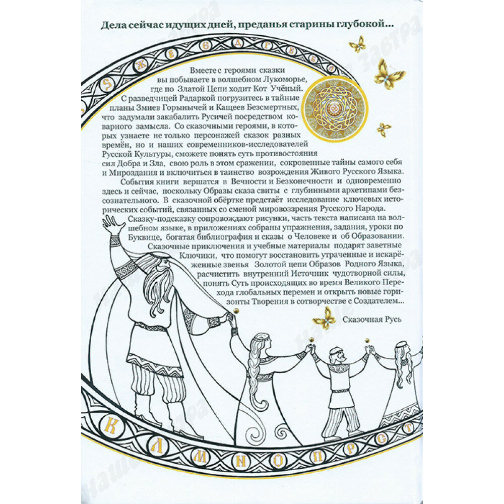 Вместе с героями сказки вы побываете в Лукоморье, где по Златой Цепи ходит Кот Учёный. С разведчицей Радаркой погрузитесь в тайные планы Змиев Горынычей и Кащеев Безсмертных, что задумали закабалить Русичей посредством коварного замысла. Со сказочными героями, в которых узнаете не только персонажей сказок разных времён, но и наших современников-исследователей Русской Культуры, сможете понять суть противостояния сил Добра и Зла, свою роль в этом сражении, сокровенные тайны самого себя и Мироздания и включиться в таинство возрождения Живого Русского Языка.