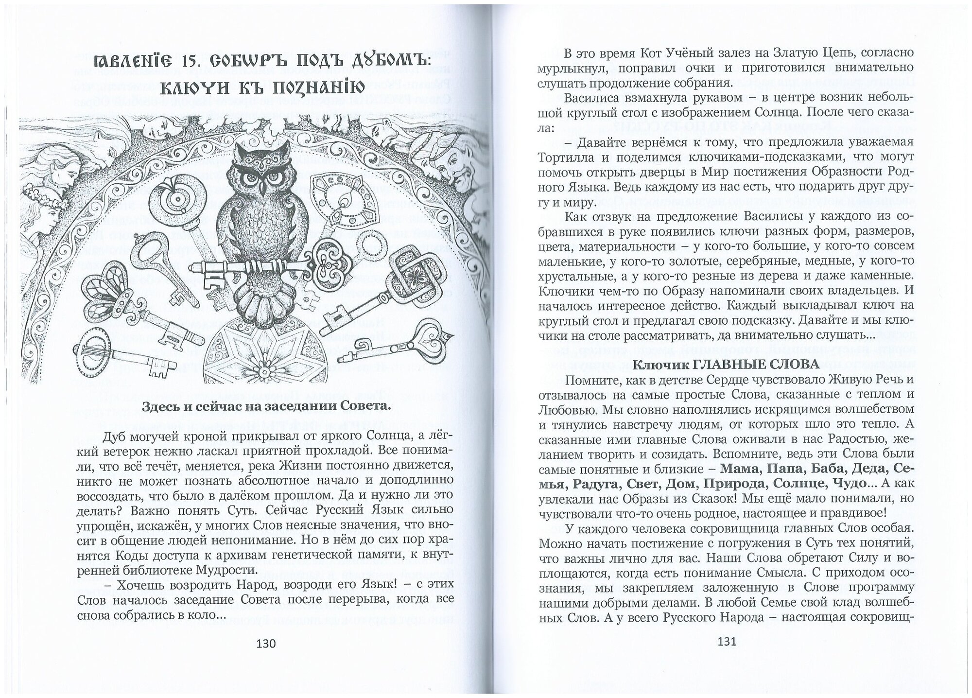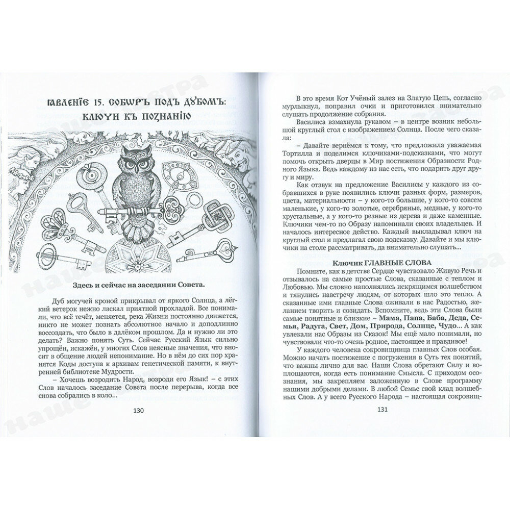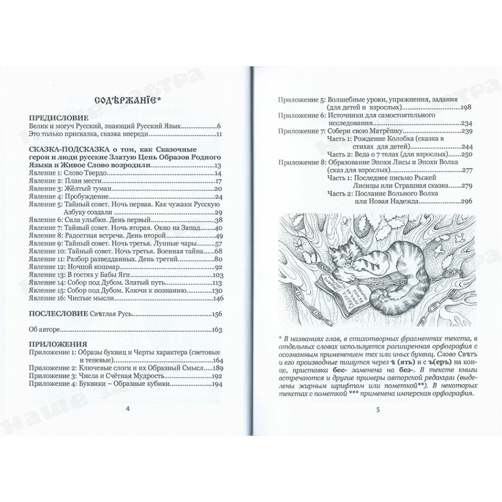 Сказку-подсказку сопровождают рисунки, часть текста написана на волшебном языке, в приложениях собраны упражнения, задания, уроки по Буквице, богатая библиография и сказы о Человеке и об Образовании. Сказочные приключения и учебные материалы подарят заветные Ключики, что помогут восстановить утраченные и искарёженные звенья Золотой цепи Образов Родного Языка, расчистить внутренний Источник чудотворной силы, понять Суть происходящих во время Великого Перехода глобальных перемен и открыть новые горизонты Творения в сотворчестве с Создателем.