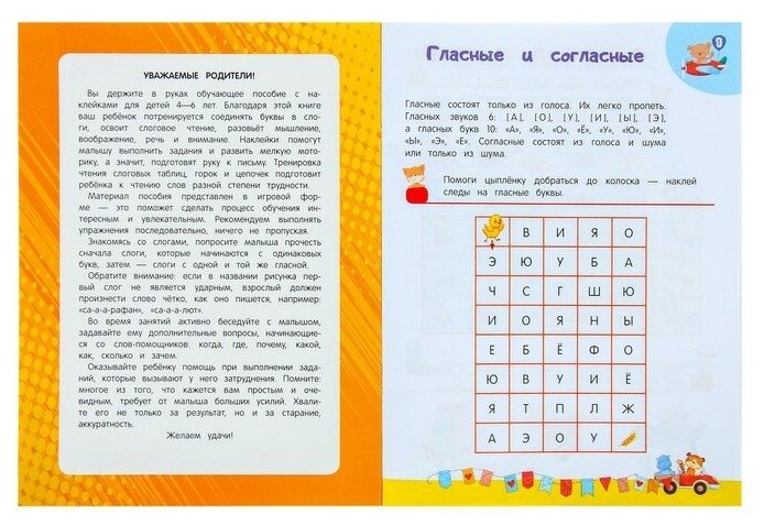Хорошее пособие для занятий с теми детьми, которые уже знают буквы и теперь следующая задача - научиться читать слоги. На каждом развороте - свои слоги - парные, глухие, звонкие и примеры их соединения с гласными буквами. Плюс для дополнительного закрепления материала - в комплекте идут наклейки, которые необходимо вклеить в упражнения. Вобщем, все достаточно просто для изучения, но вместе с тем интересно.