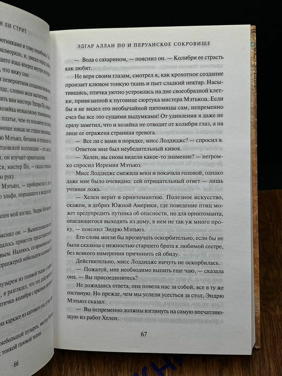 К ее рассказам о предостережениях, якобы полученных от птиц, и о визите духа любимого По относится крайне скептически, но вот мисс Лоддиджс похищена, и теперь писателю с помощью друга, шевалье Огюста Дюпена, предстоит распутать клубок тайн, в котором тесно переплелись давняя вражда, гибель задушевного друга, орнитомантия и легендарное Перуанское Сокровище.