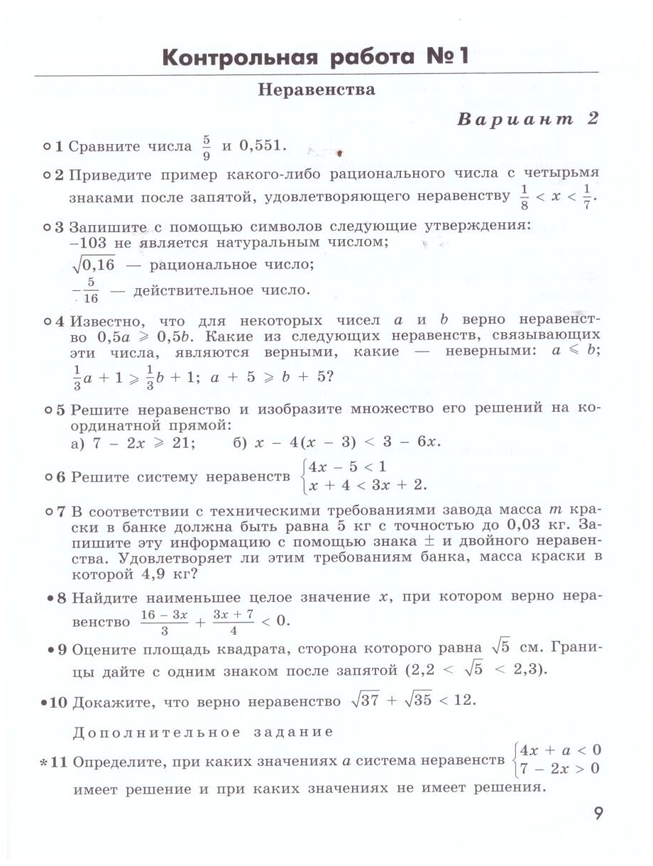 Пособие содержит контрольные работы по курсу алгебры 9 класса, ориентированные на учебник "Алгебра. 9 класс" Г. В. Дорофеева и др. Каждая работа содержит задания трёх уровней сложности, обозначенные специальными значками, помогающими понять предъявляемые требования к усвоению материала. На обороте страницы с текстом каждого варианта приведена сопроводительная страничка для самоконтроля, помогающая учащимся осознанно и целенаправленно подходить к процессу обучения.