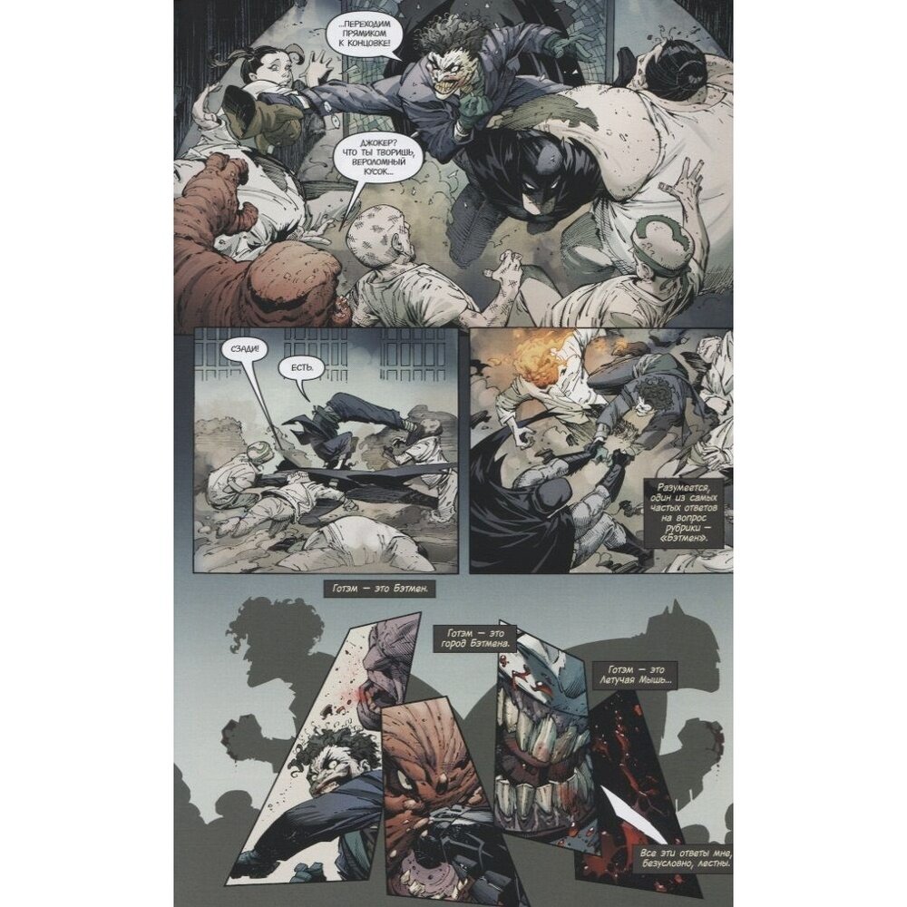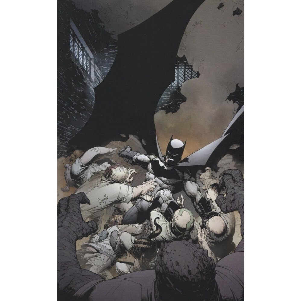Об издании. Книга в твёрдом переплёте, прошита черными нитками и проклеена. Обложка матовая с выборочным лакированием, бумага гладкая. Из 384 страниц 25 выделены на доп материалы (13 – галерея обложек, 6 - сценарий страниц комикса и наброски, 4 – примечания, 2 – реклама). Крутое издание, которое стоит своих денег. Формат очень удобен, в нём хотят переиздать всю серию, что отлично подойдёт для не успевших купить первое издание. Понравиться всем фанатам Бэтмена.