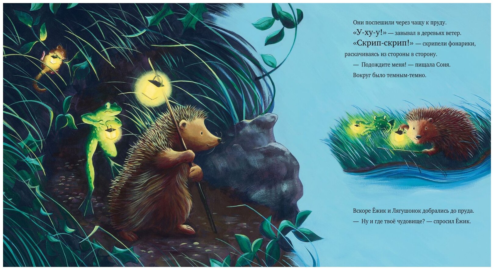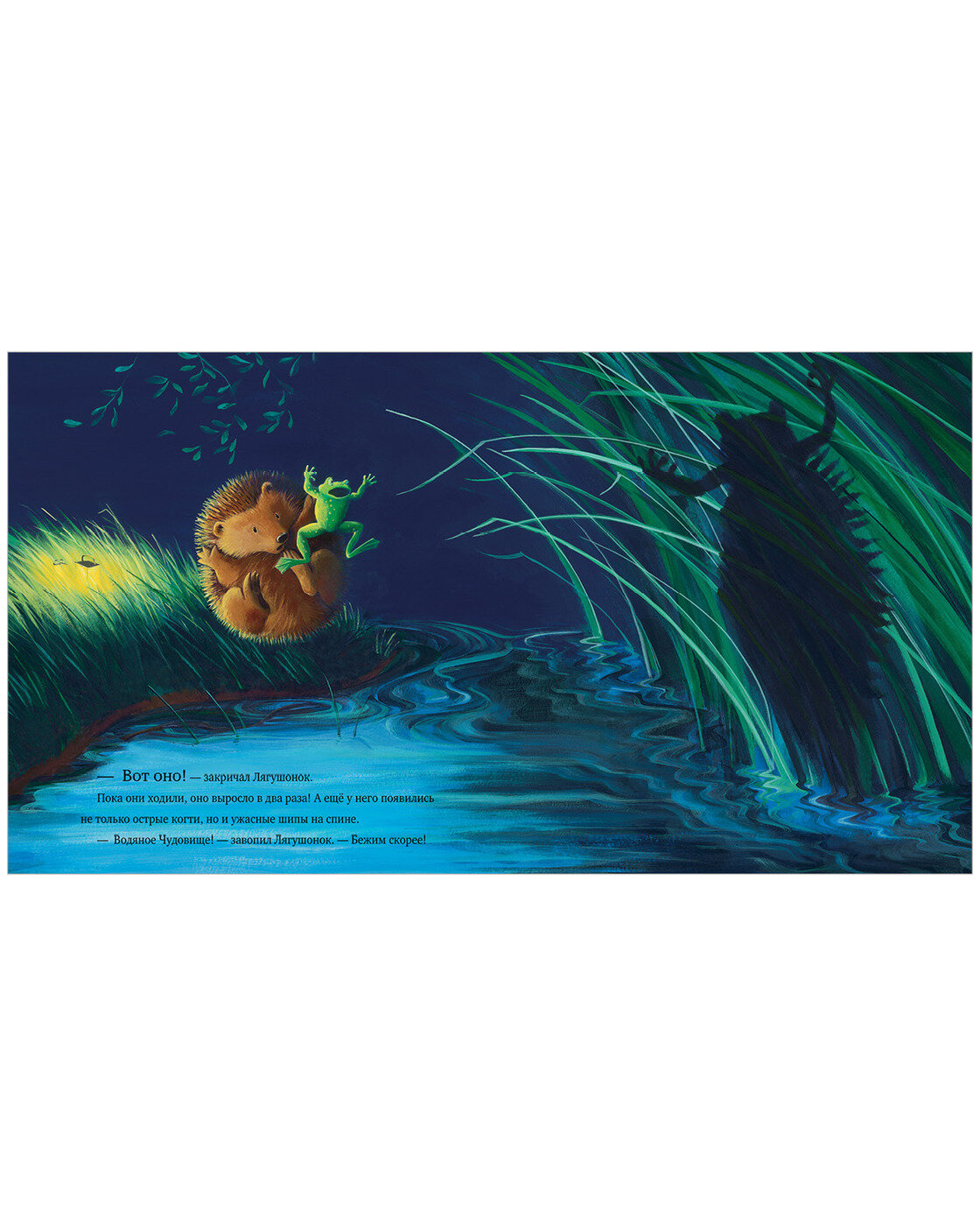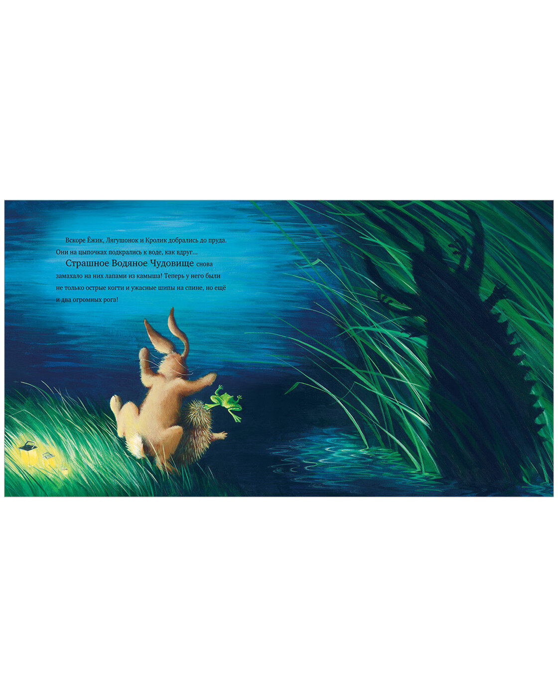 Темной, темной ночью Лягушонок возвращался в свой родной пруд после долгой зимы. У-у-у! - завыл ветер в деревьях. Ой, кто же это притаился там, в темноте? Стра-а-ашное Водяное Чудище! По крайней мере, так подумал Лягушонок. Сможет ли он добраться до дома мимо Чудища? Или... просто у страха глаза велики?