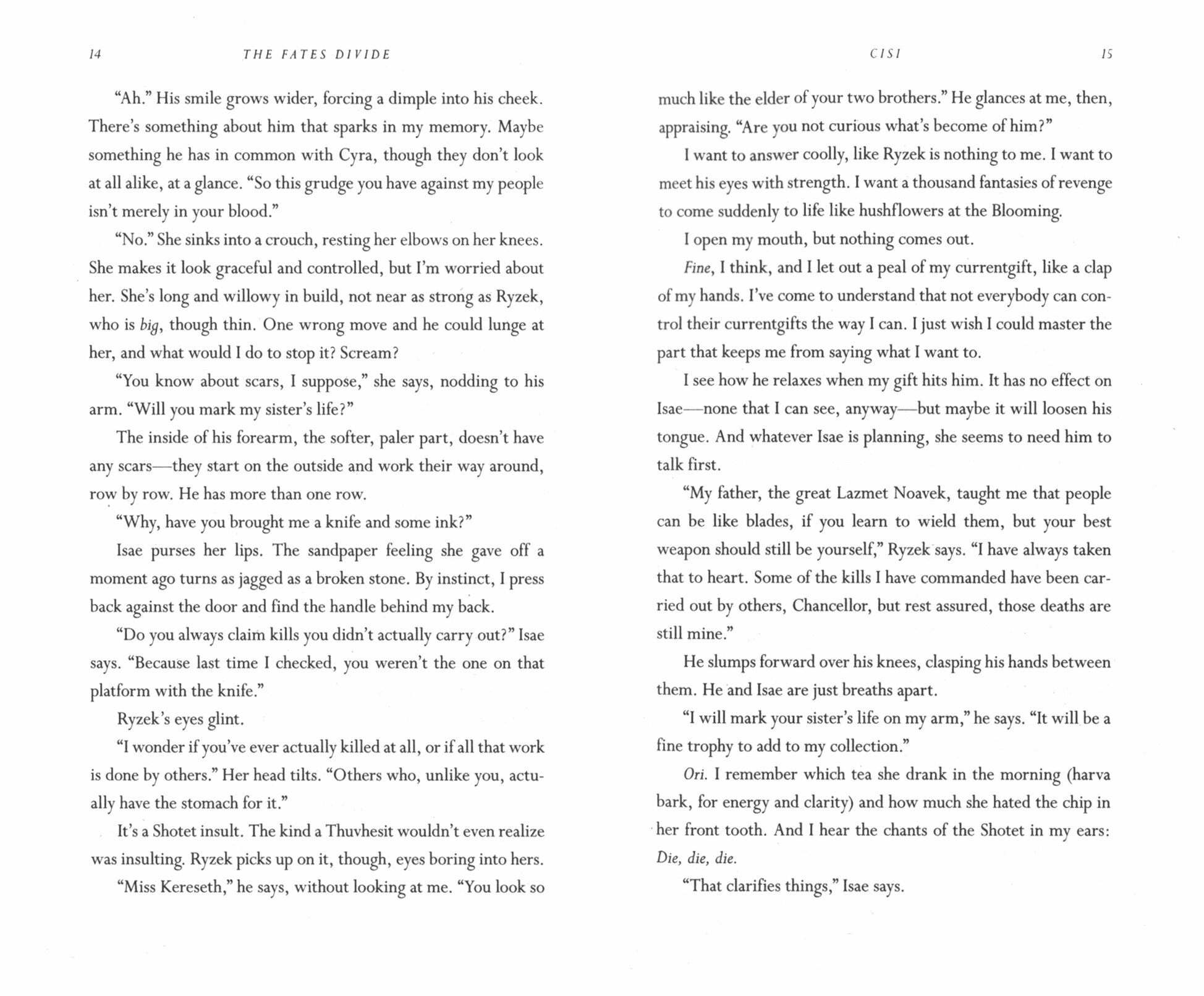 In the second book of the Carve the Mark duology, globally bestselling Divergent author Veronica Roth reveals how Cyra and Akos fulfill their fates. The Fates Divide is a richly imagined tale of hope and resilience told in four stunning perspectives.The lives of Cyra Noavek and Akos Kereseth are ruled by their fates, spoken by the oracles at their births. The fates, once determined, are inescapable.Akos is in love with Cyra, in spite of his fate: he will die in service to Cyra’s family. And when Cyra’s father, Lazmet Noavek – a soulless tyrant, thought to be dead – reclaims the Shotet throne, Akos believes his end is closer than ever.As Lazmet ignites a barbaric war, Cyra and Akos are desperate to stop him at any cost. For Cyra, that could mean taking the life of the man who may – or may not – be her father. For Akos, it could mean giving his own. In a stunning twist, the two will discover how fate defines their lives in ways most unexpected.