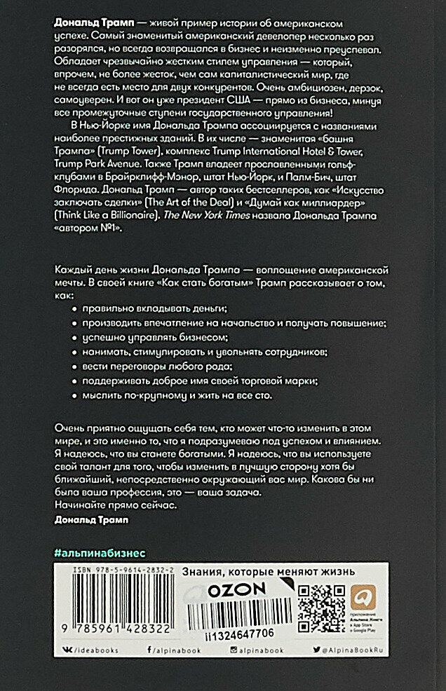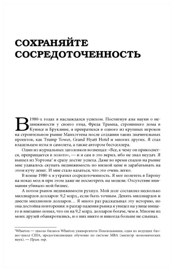 В своей книге Дональд Трамп, риелтор-миллиардер, автор многих бестселлеров, политический деятель, избранный в 2016 году президентом США, открывает секреты своего успеха. Он пишет о том, как правильно вкладывать деньги; производить впечатление на руководителя и получать повышение; успешно управлять бизнесом; нанимать, стимулировать и увольнять сотрудников; вести переговоры; поддерживать доброе имя своей торговой марки; мыслить по-крупному и жить на все сто. Книга полна деловых советов и житейской мудрости и рассказывает о том, как легальным образом создаются огромные состояния и как управлять первоклассным бизнесом.