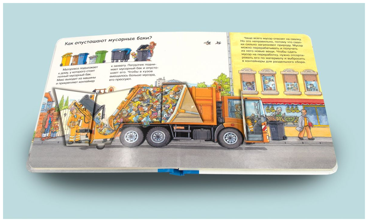 На каждом книжном развороте внимание любознательного малыша привлекут красочные сюжетные иллюстрации узнаваемых жизненных ситуаций, связанных с назначением и использованием машин, которые делают город чистым.