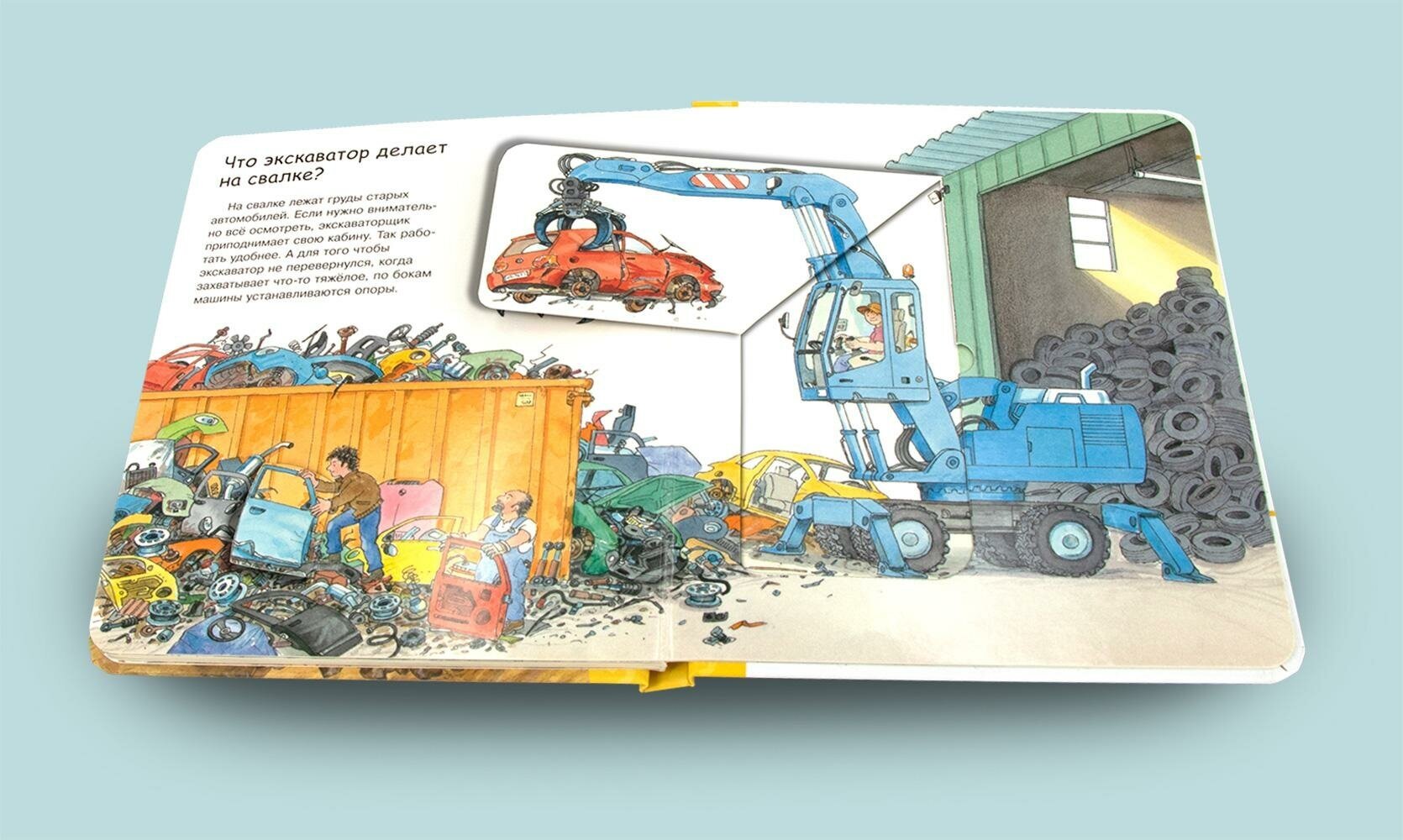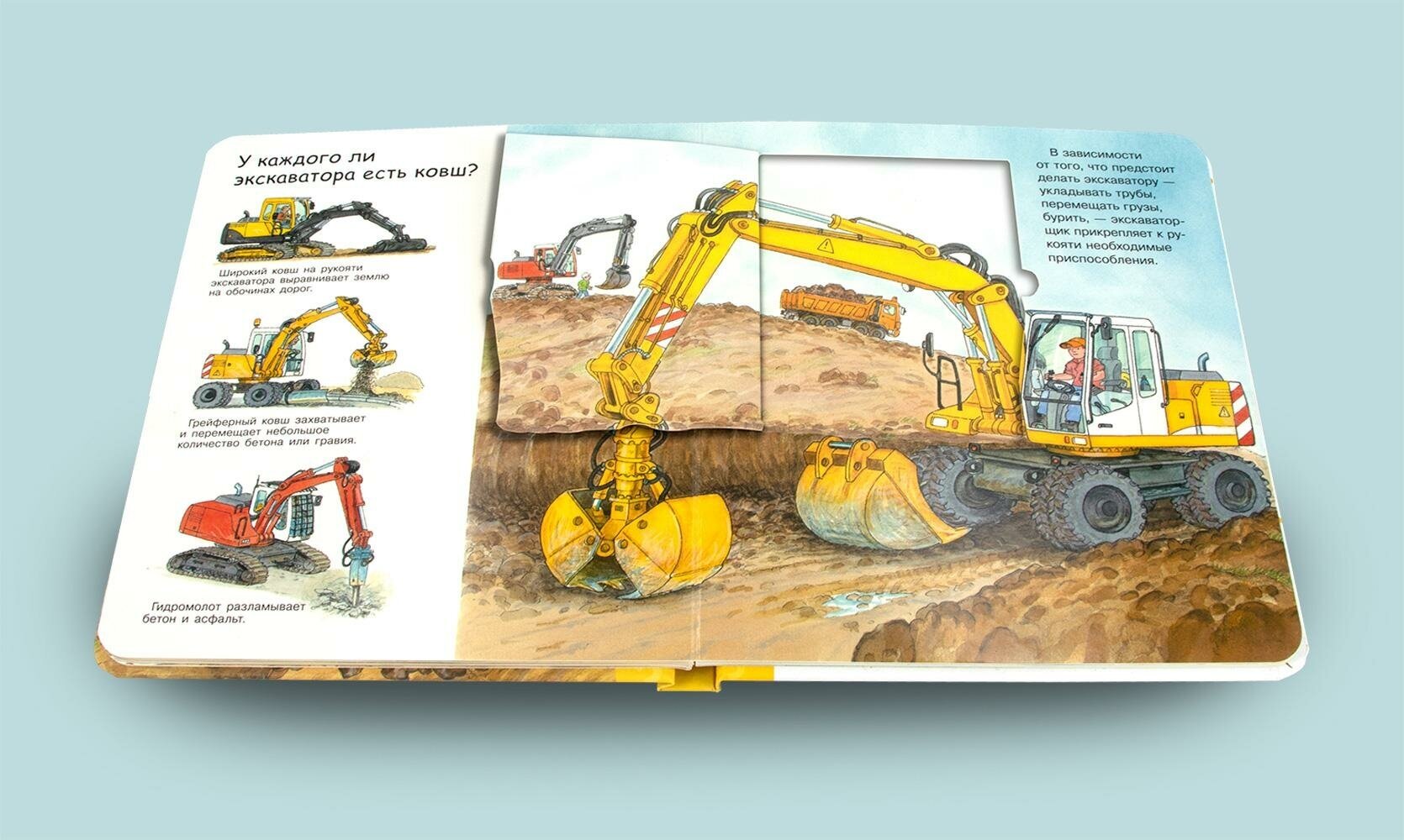 На каждом книжном развороте внимание любознательного малыша привлекут красочные сюжетные иллюстрации узнаваемых жизненных ситуаций, связанных с назначением и использованием экскаватора.