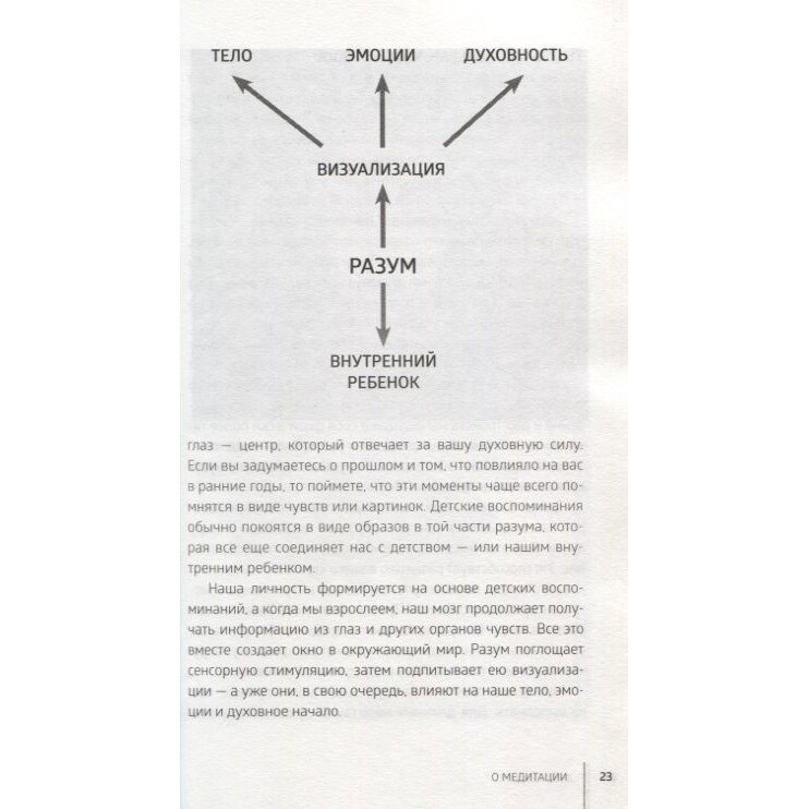В принципе неплохая книга, но очень скудно написано по содержанию (зато целый разворот отведён для названия главы). Фактически здесь просто перечислены по пунктам некоторые медитации. А также такие важные моменты - где какие чакры. Хорошо, что есть рисунки, чтобы визуально всё представить можно было себе.