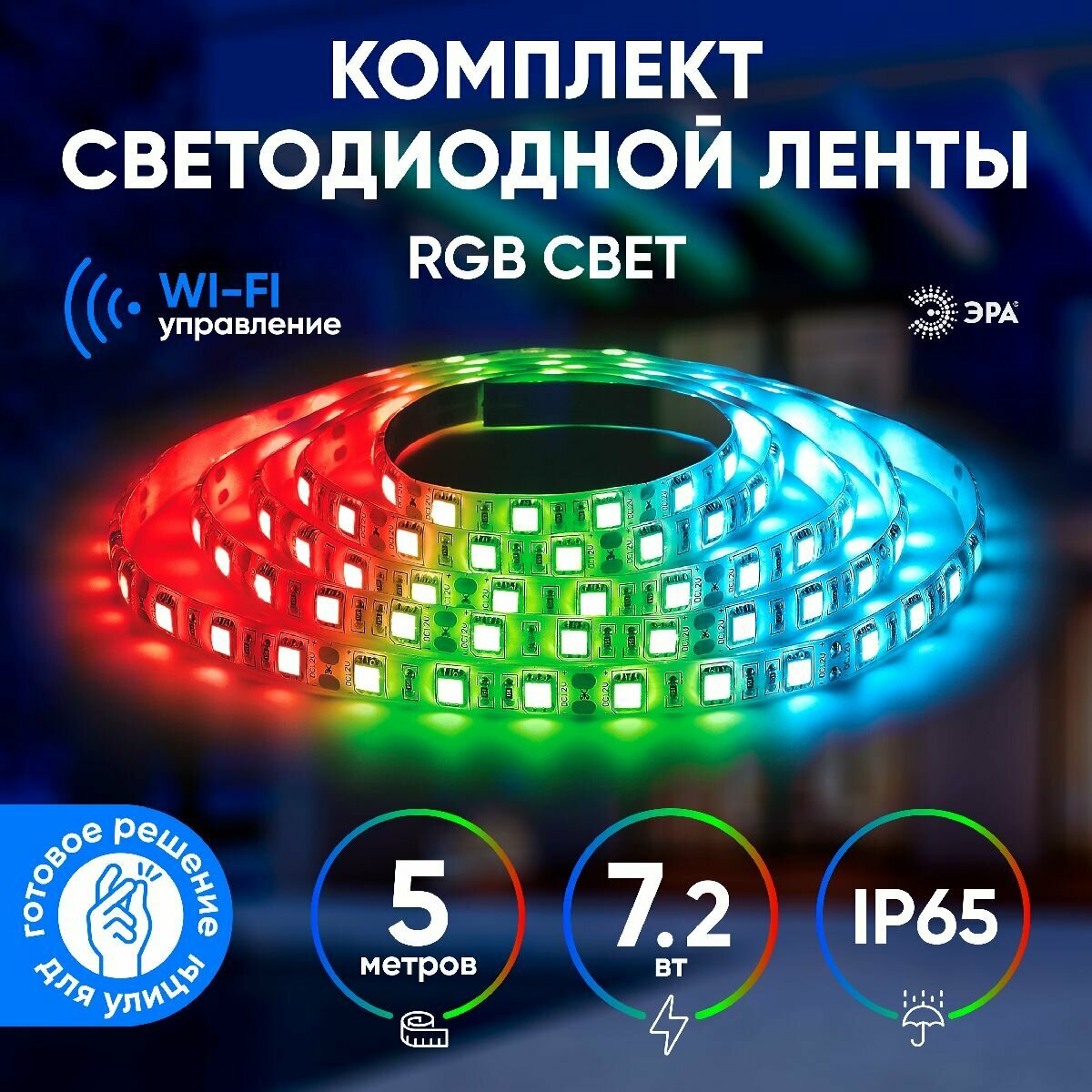 - Умная Wi-Fi светодиодная RGB лента ЭРА. Комплект 5050-30-RGB-IP65-Wifi-5m.
