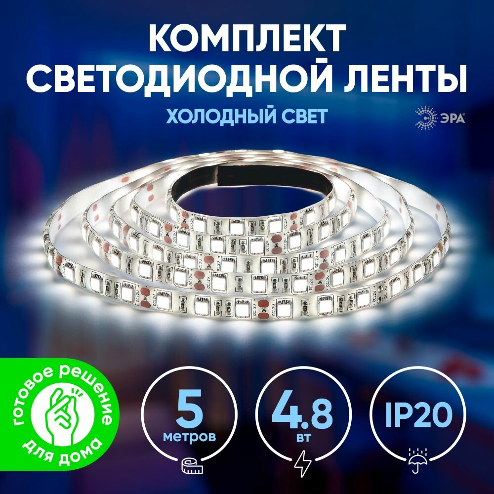 Комплект одноцветной светодиодной ленты 12 В, 4,8 Вт/м, цветовая температура 6500 К, влагозащищенность IP20. Длина ленты 5 м. Тип светодиода 2835, 60 LED/м. В составе комплекта: LED лента на двустороннем скотче, источник питания, коннекторы. Готовое решение для внутреннего освещения, подсветки ниш, лестничного пространства, систем хранения, декоративного и художественного оформления. Внимание: во избежание выхода из строя не допускается длительная работа ленты в смотанном виде!