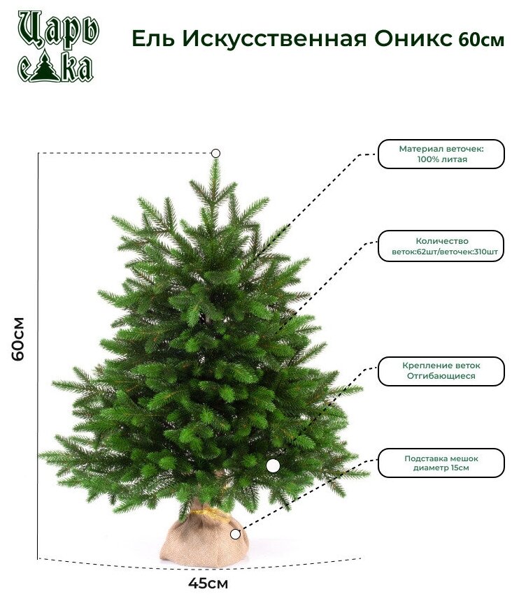 Используемый материал, а именно 100% PE, является абсолютно безопасным материалом, не вызывающим аллергические реакции. Ель Оникс является пушистой и ровной со всех сторон.