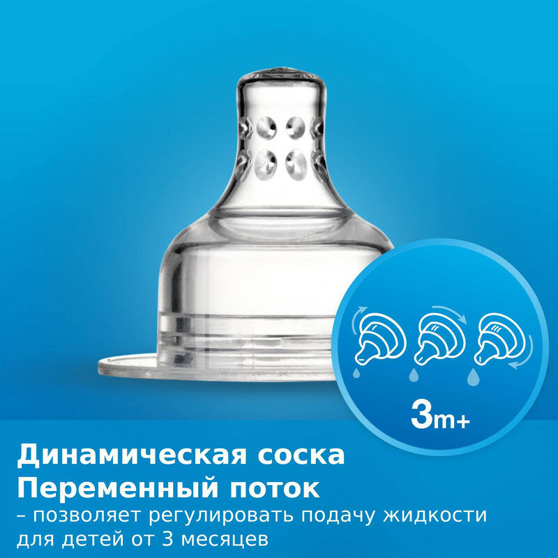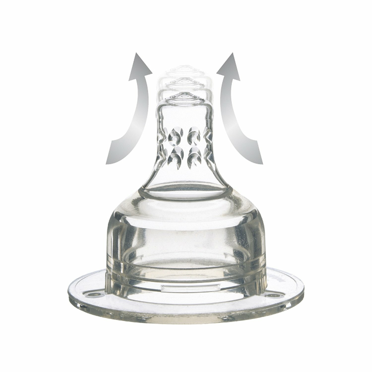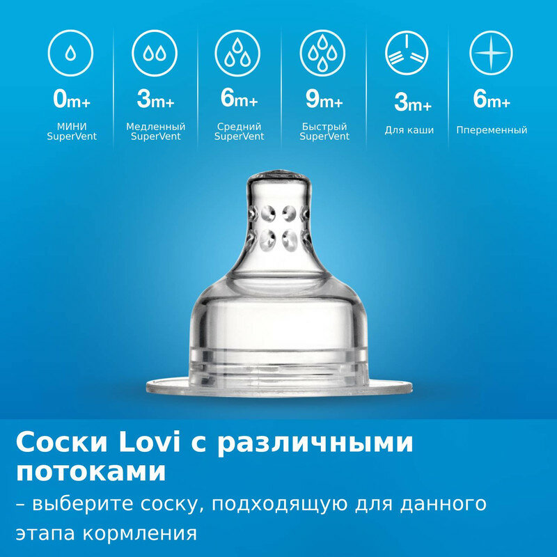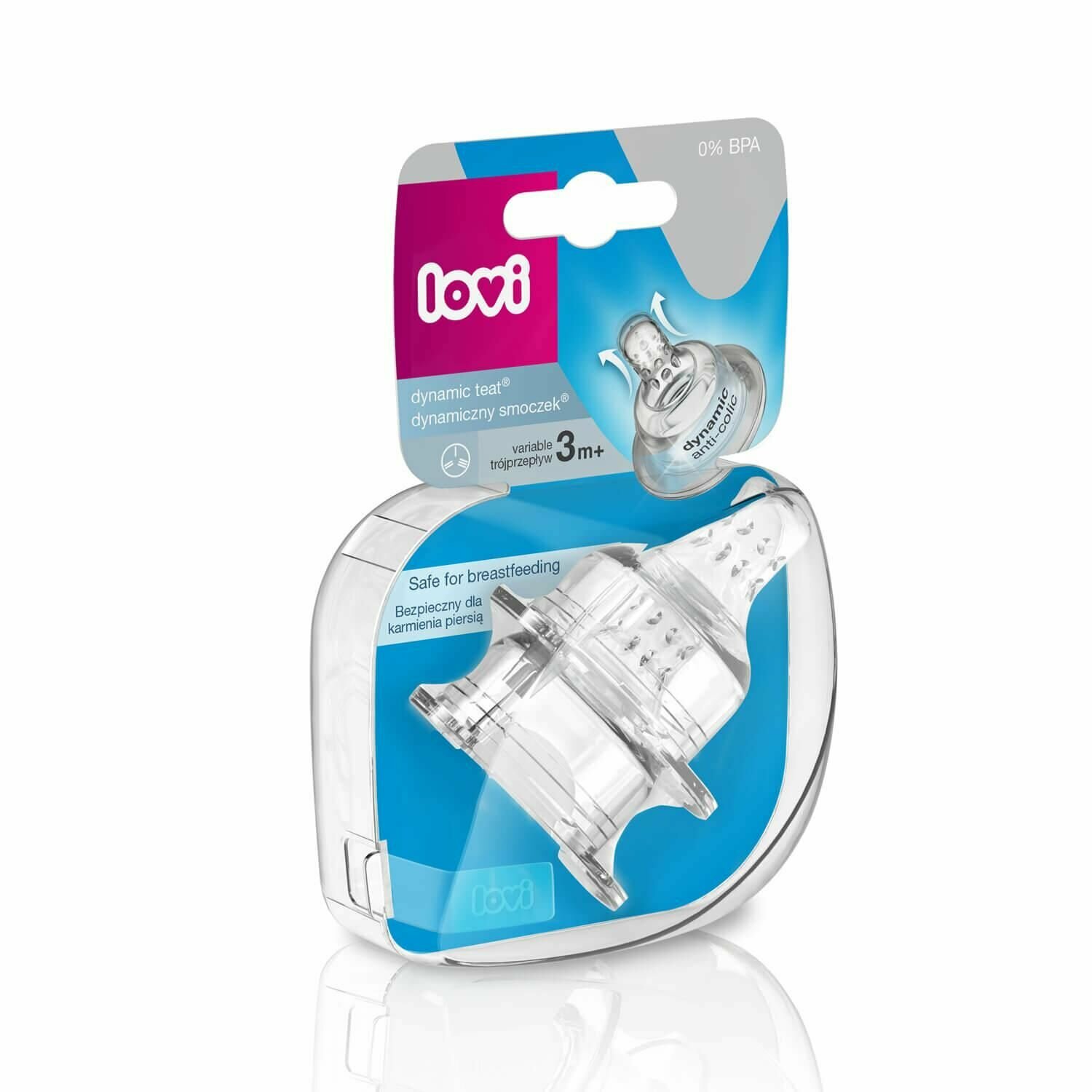 Данная модель соски позволяет менять скорость потока жидкости в зависимости от того, какая сторона соски соприкасается с языком ребенка. Динамическая соска LOVI очень похожа по тактильным ощущениям на сосок матери. Соска разработана по уникальной технологии неоднородных слоев силикона: имеет мягкий, тонкий растягивающийся кончик и твердое, широкое, профилированное основание. Благодаря чему не препятствует грудному вскармливанию и ребенок буквально мгновенно привыкает к ней и не испытывает стресса.