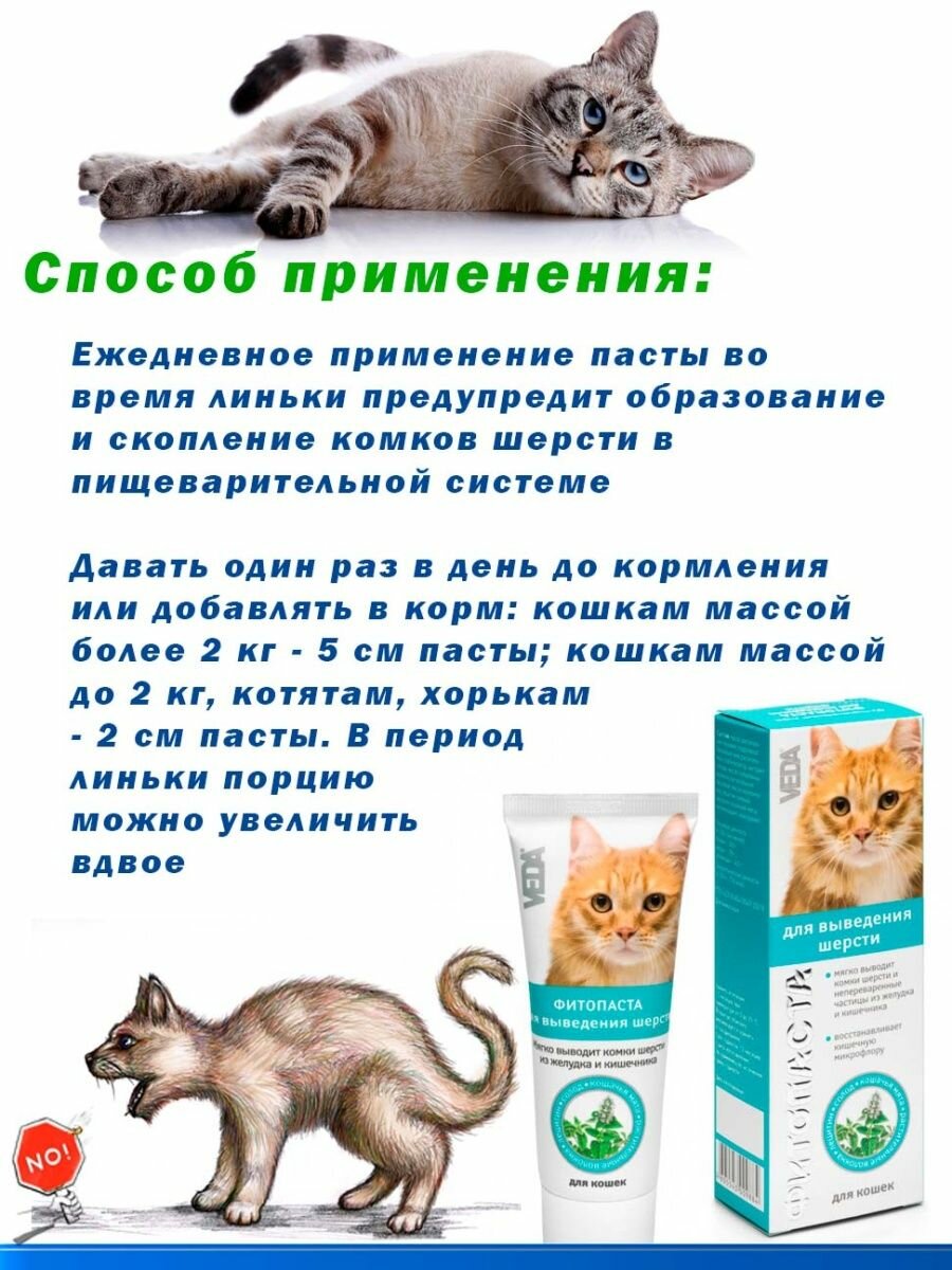 Ежедневное применение пасты во время линьки предупредит образование и скопление комков шерсти в пищеварительной системе.