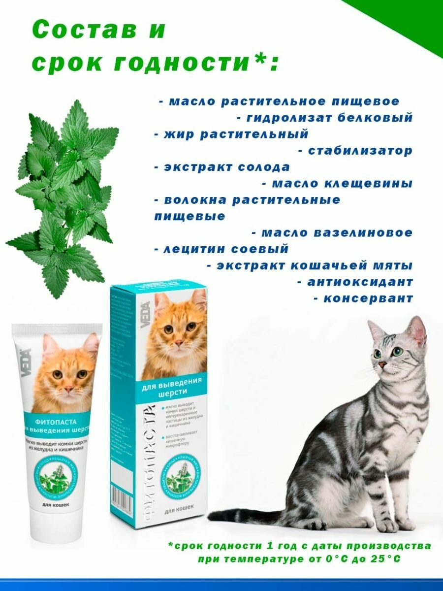 Фитокомпоненты пасты усиливают действие друг друга и дают максимальный эффект для вывода проглоченной шерсти и других неперевариваемых частиц.