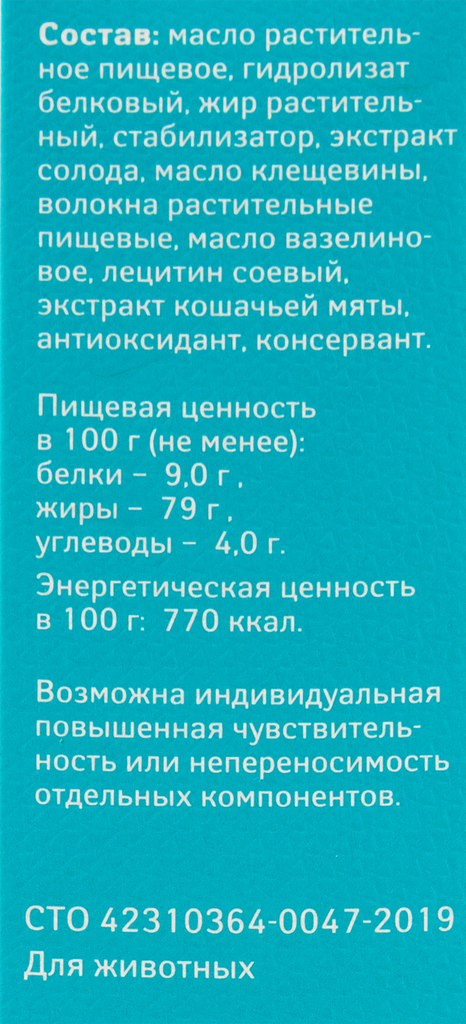 | Состав | масло растительное пищевое, гидролизат белковый, жир растительный, стабилизатор, экстракт солода, масло клещевины, волокна растительные пищевые, масло вазелиновое, лецитин соевый, экстракт кошачьей мяты, антиоксидант, консервант |