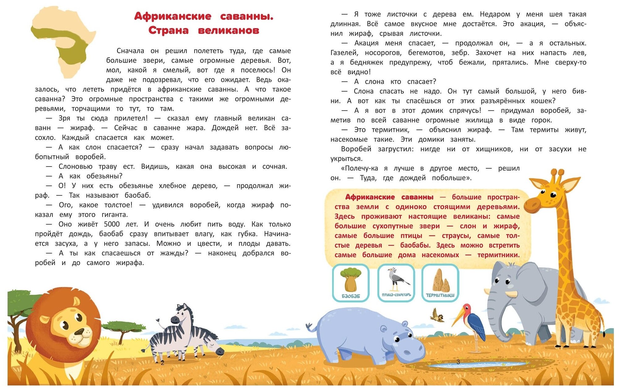 Очень красивая и увлекательная книга. Понравилось то, что в конце каждого раздела представлены обитатели и растения этой части континента. Красивые иллюстрации и плотный переплет. Книга подойдёт как детям дошкольного возраста, так и детям, учащимся в начальных классах. Покупкой довольна. Спасибо автору, издательству и Лабиринту