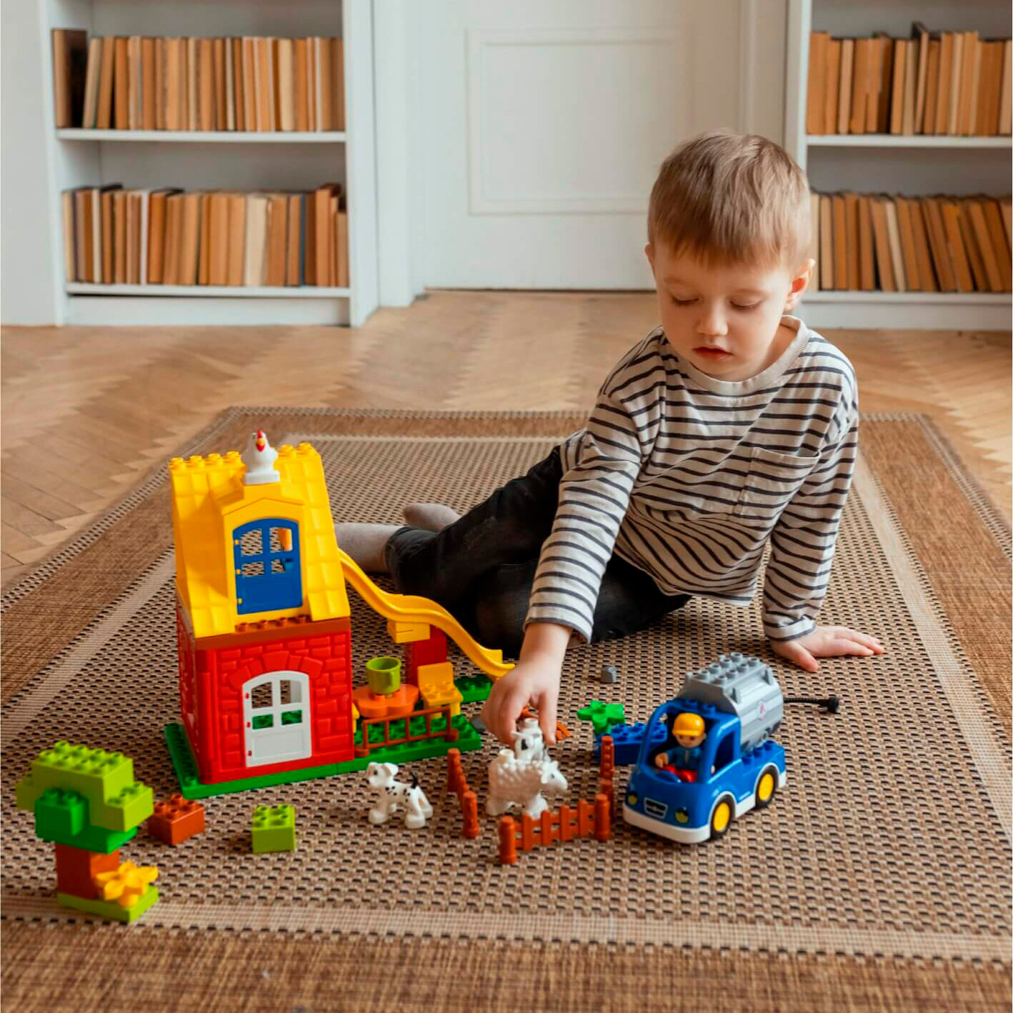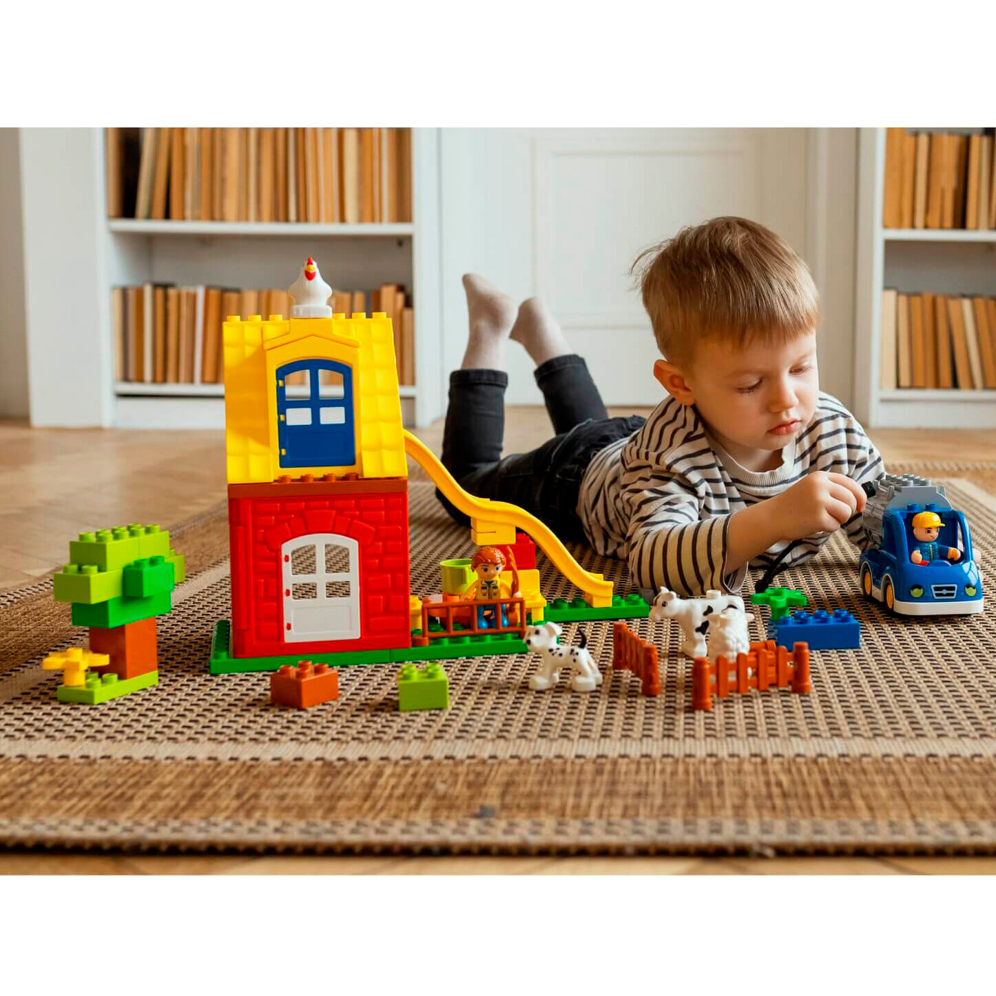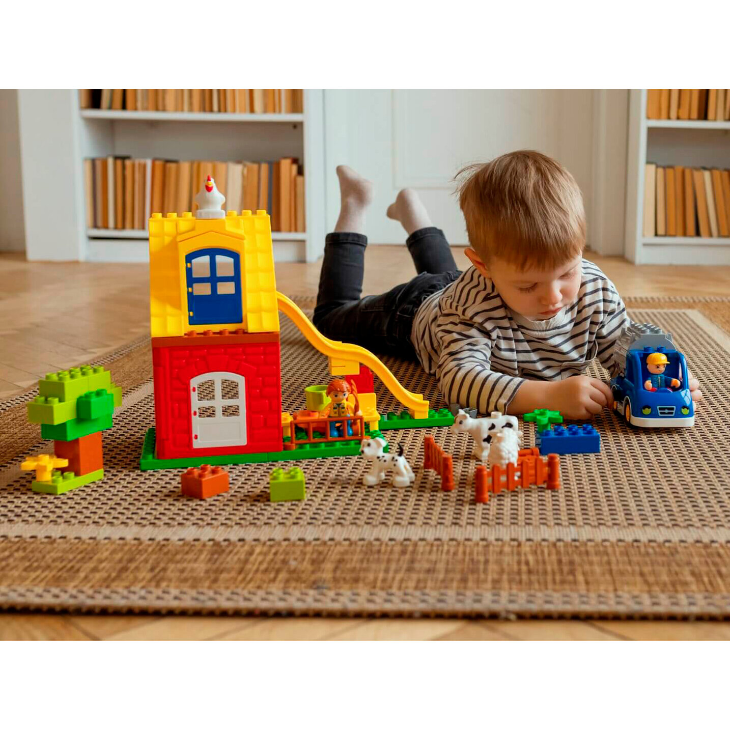 Из разноцветных деталей ребенок может собрать различные сооружения: дом, загон для скота, птичник и многое другое. В наборе есть фигурки коровы, лошади, свиньи и цыплят. Они выполнены из качественного пластика, который безопасен для здоровья детей. Особенности конструктора: