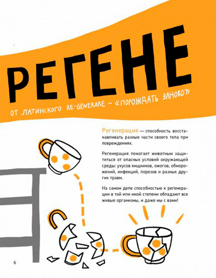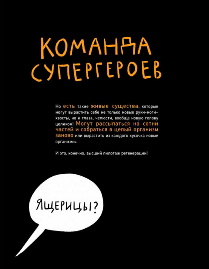 Ну а эту книжку больше всех в нашей семье ждал мой десятилетний сын. Это вторая часть серии книг о "микросупергероях", в первой речь шла о тихоходках, которые способны выживать практически в любых условиях. Мишу очень увлекло, ему очень понравилась подача информации через чудесные рисунки, то есть, это, можно сказать, в некотором смысле научный комикс, но не совсем. Сам материал подается крайне увлекательно. Во второй части, как это понятно из названия, рассказывается о существах, которые имеют способность к регенерации.
