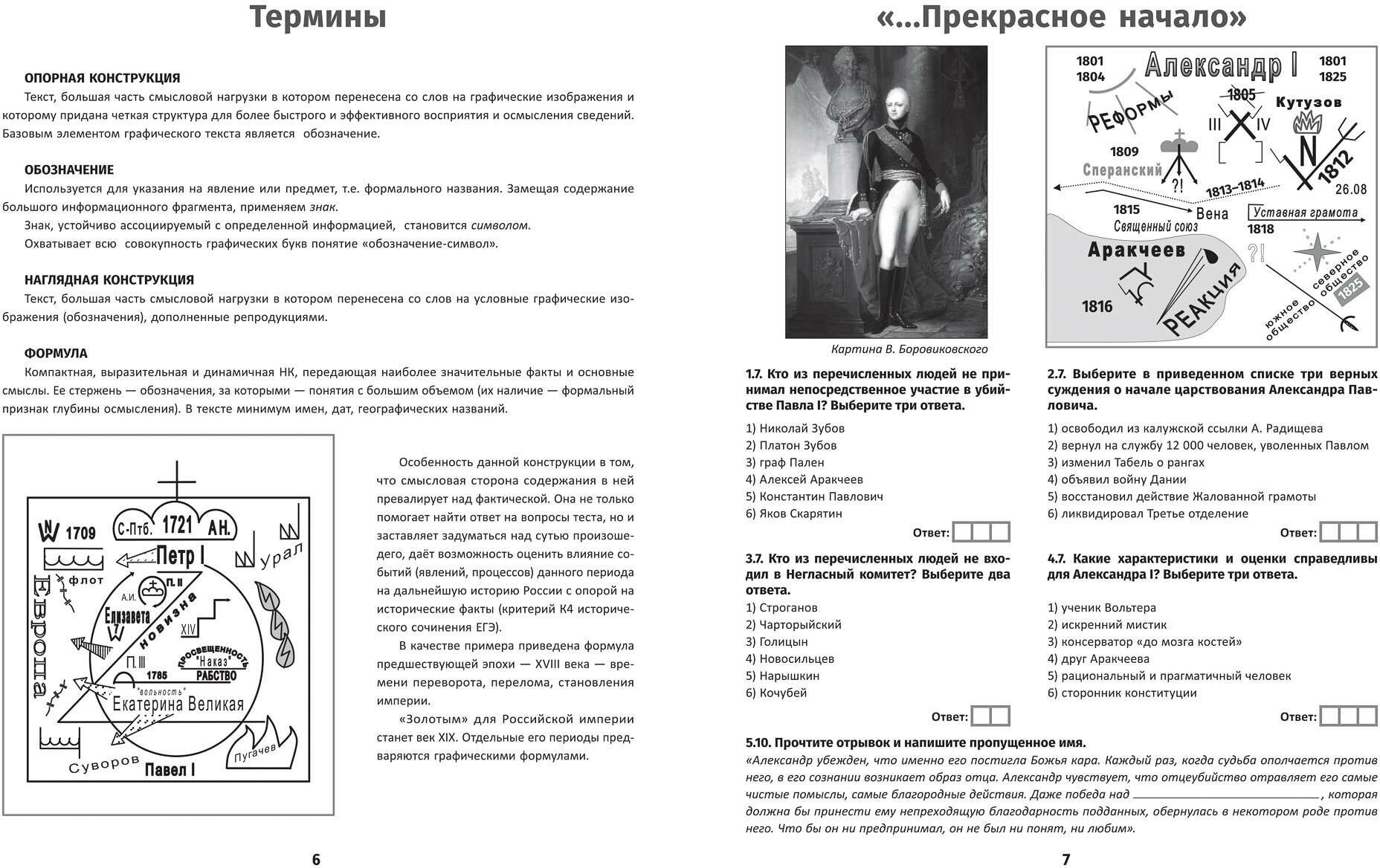 Изобразительный ряд пособия дополняется контрольно-измерительными материалами экзамена. Особое внимание уделено картам. Большая часть графического материала - это опорные графические конструкции, то есть тексты, большая часть смысловой нагрузки в которых перенесена со слов на условные графические изображения (обозначения), дополненные репродукциями. Полученная таким образом учебная графика позволяет компактно передать большой объем фактического материала.