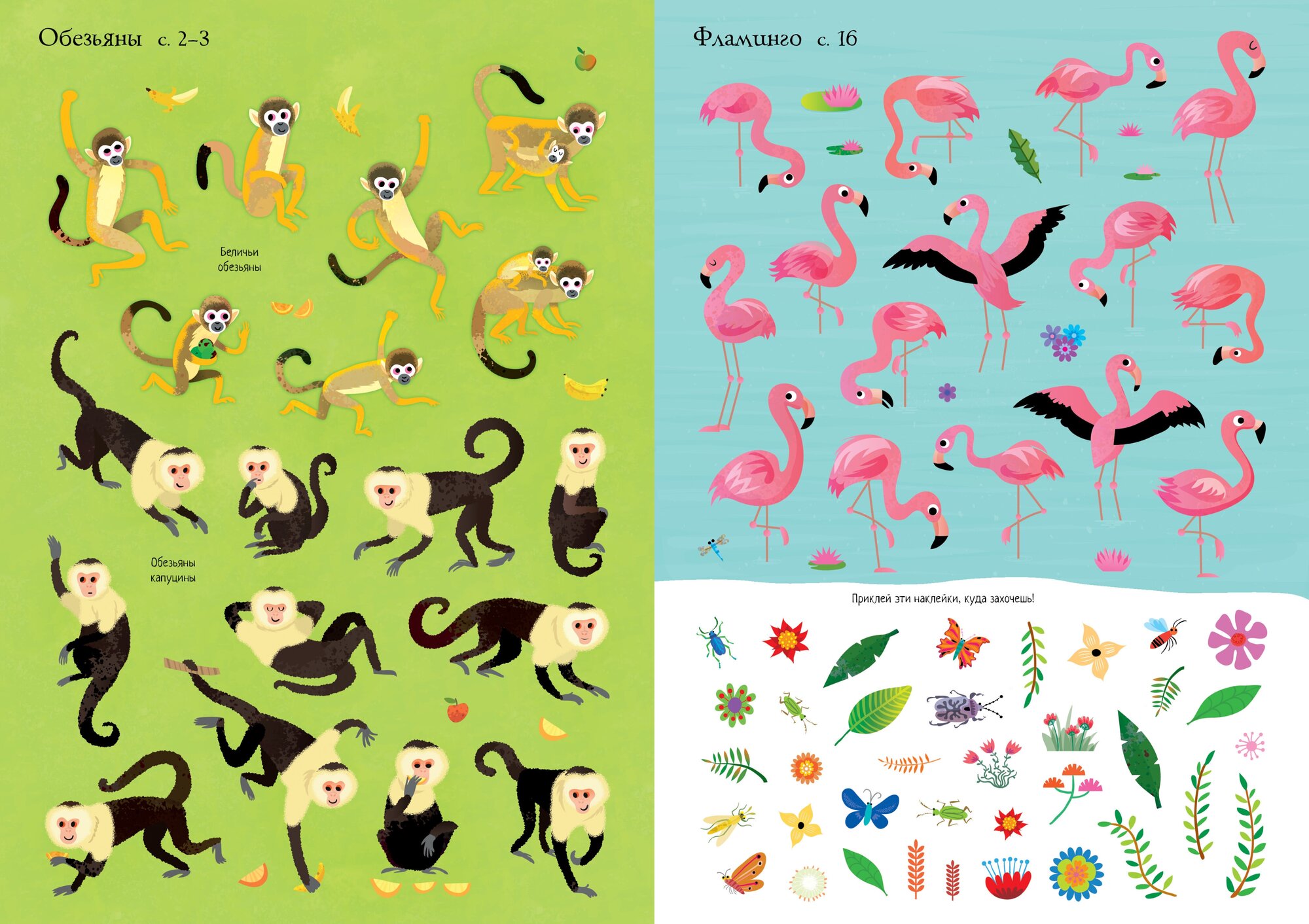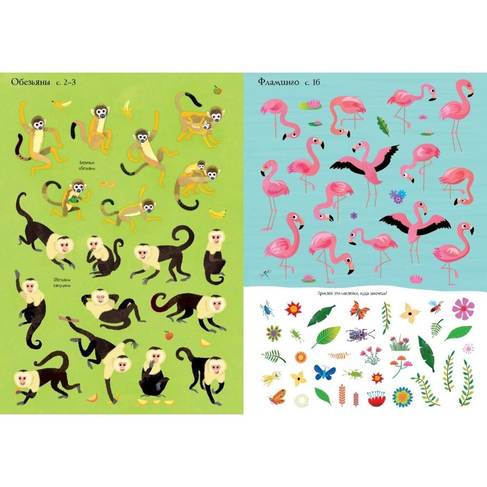 Посмотри на самых разных птиц и животных: львов, обезьян, морских котиков, попугаев и фламинго. Найди каждому животному место на страничке.
