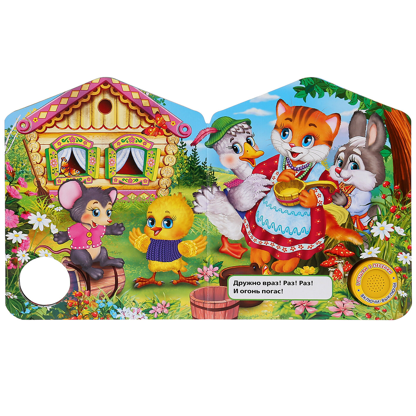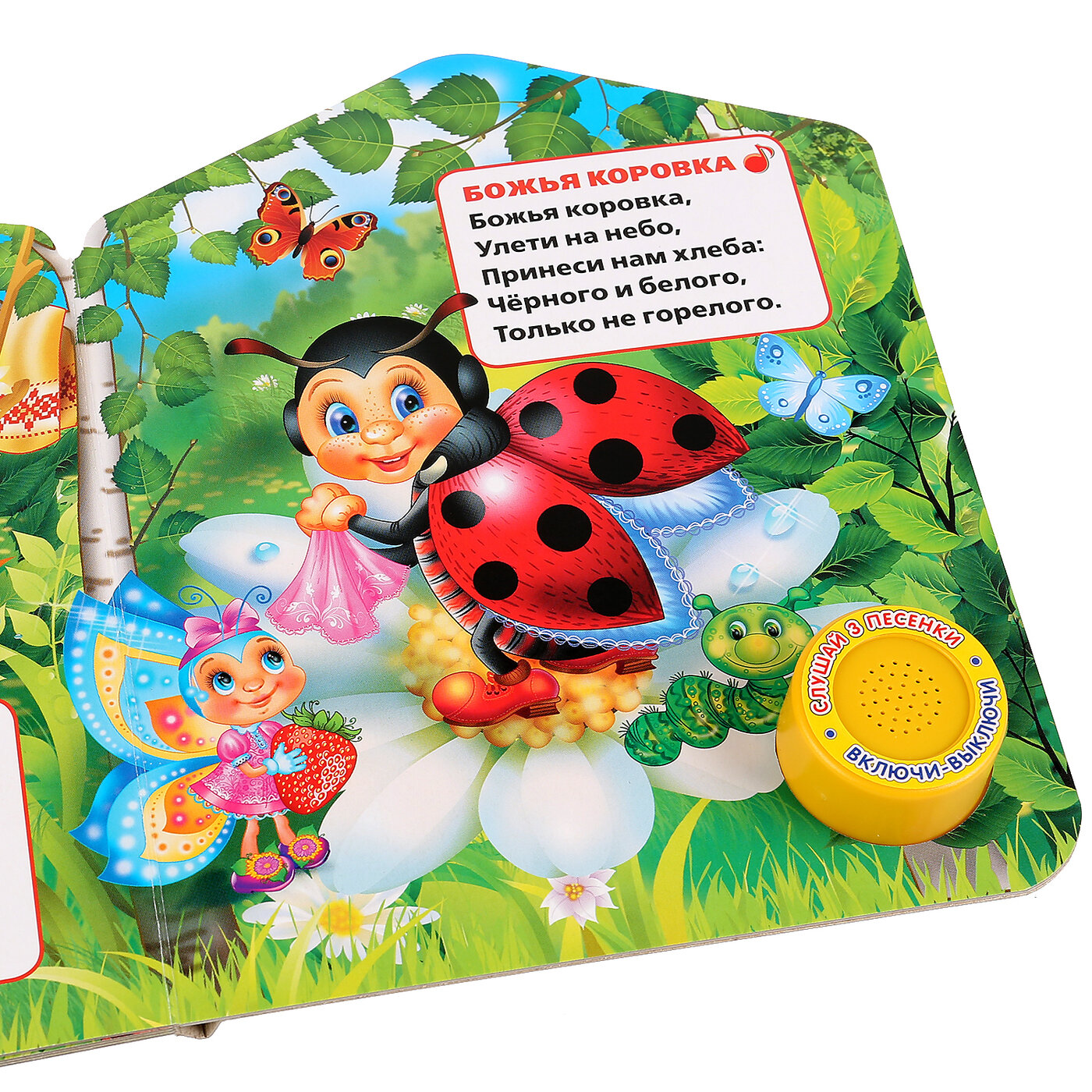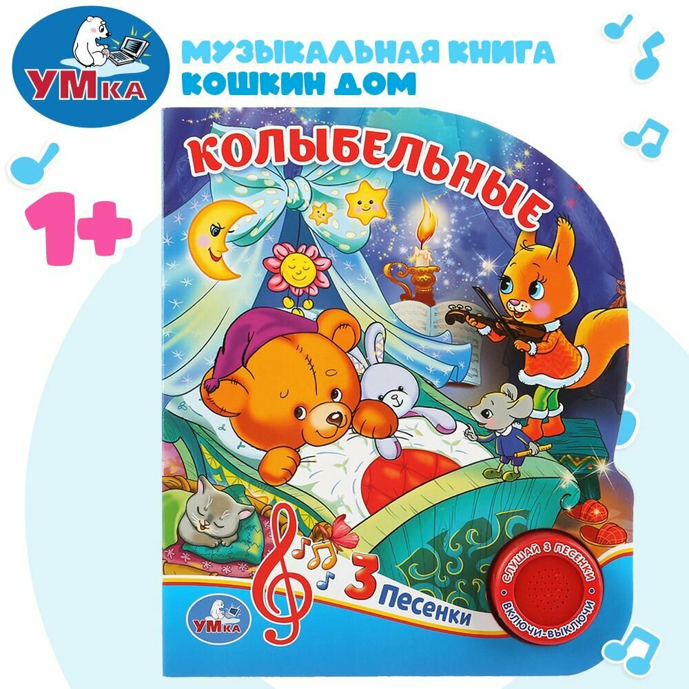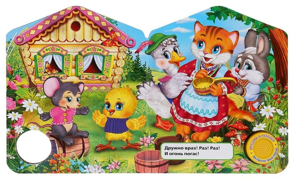 Компактная книга из прочного безопасного картона с кнопкой для прослушивания. Любимые авторы, народные фольклор, истории по мультфильма, и конечно, 3 песенки!