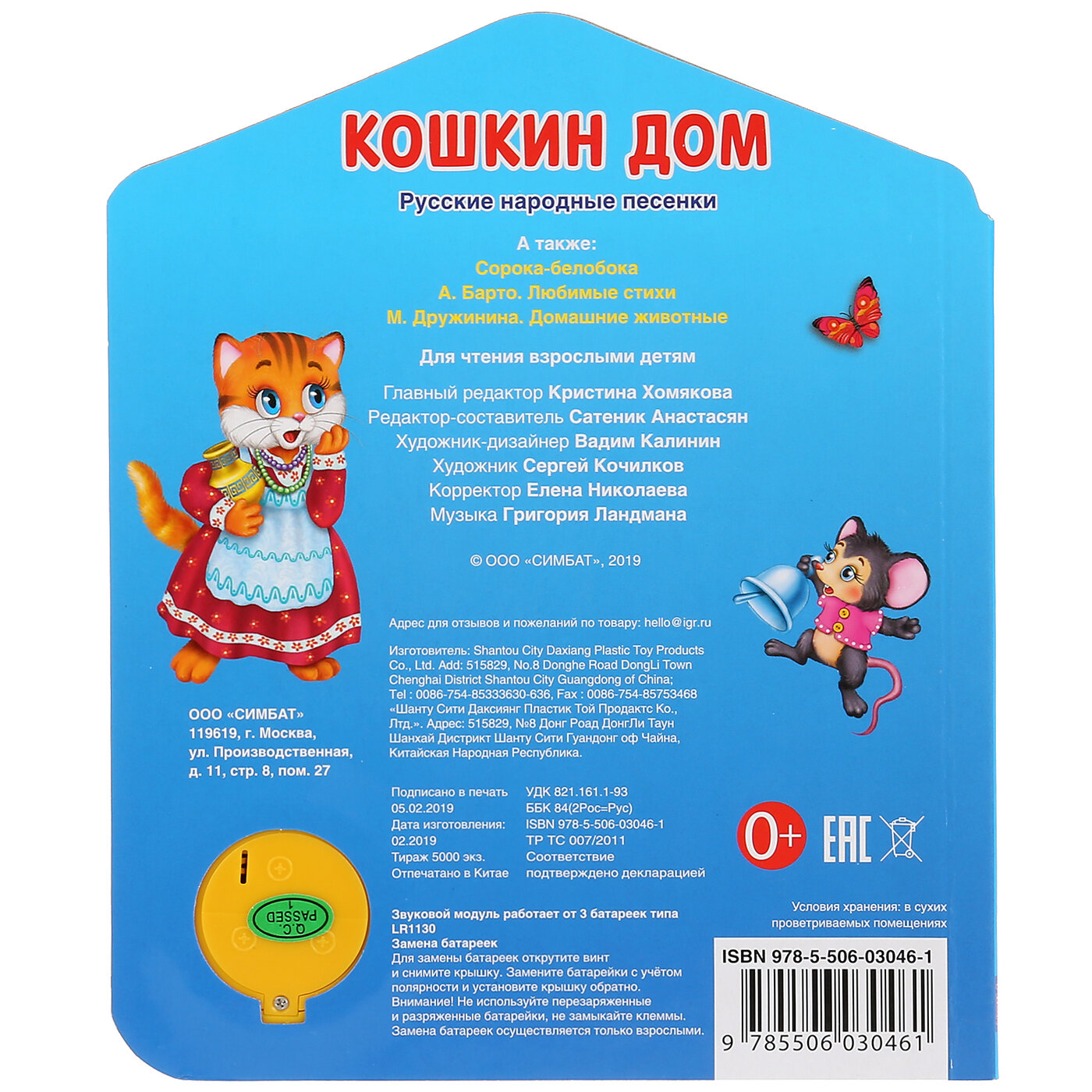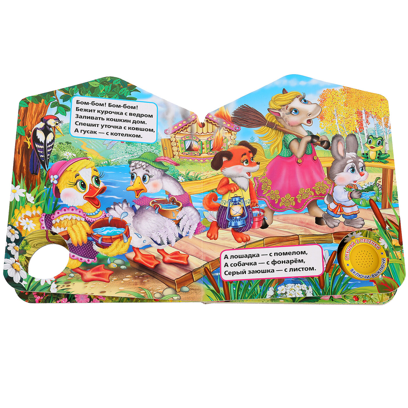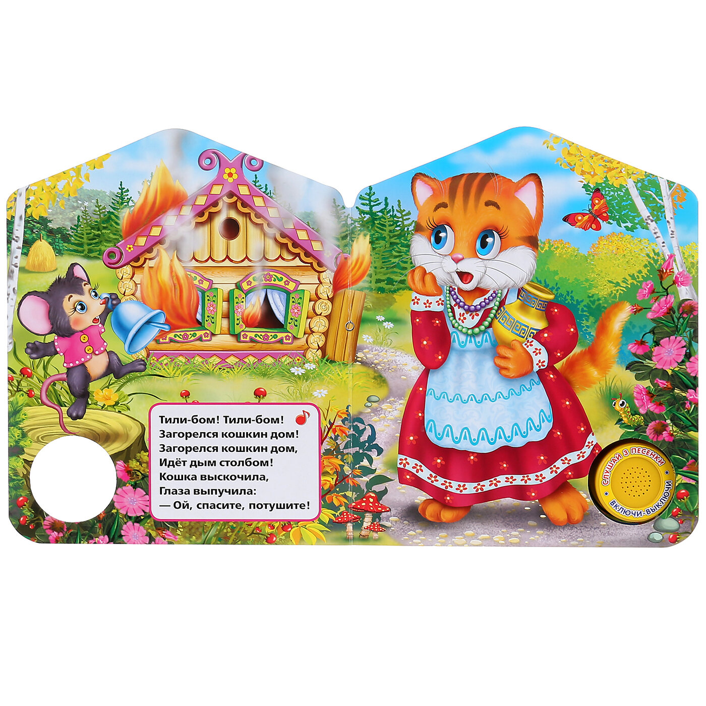 Компактная книга из прочного безопасного картона с кнопкой для прослушивания. Любимые авторы, народные фольклор, истории по мультфильма, и конечно, 3 песенки!