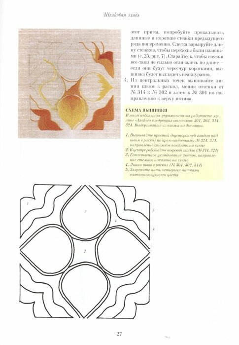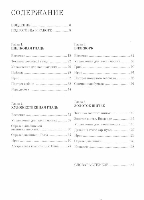 В книге рассмотрены такие техники вышивки как: шелковая гладь, художественная гладь, блэкворк, золотое шитье, упомянута и Якобинская вышивка (по Якобинской вышивке есть небольшой урок). Вкратце приведена история техник. По каждой технике приведено несколько уроков по вышивке от простых до более сложных. Рассказано о необходимых для вышивания инструментах, о натягивании ткани на подрамники. В конце книги есть словарь стежков, где в картинках наглядно показано как их выполнять. Также есть таблица перевода цветов мулине Anchor - Gamma, так как в уроках часто указывается мулине Anchor. В целом книга понравилась, но есть одно НО - некоторые материалы, которые приведены в уроках (особенно таких материалов много в Золотом шитье) - сложно достать и они довольно дороги. Не смотря на этот нюанс книга очень красивая, порадует ценителей вышивки, может стать отличным подарком. -