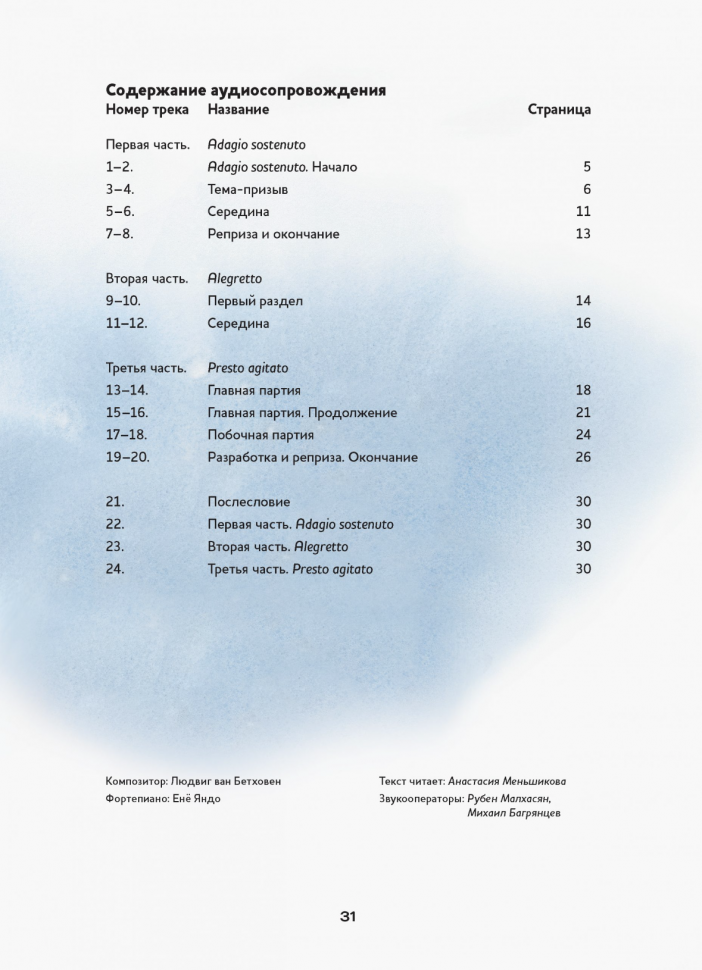 Чарующие звуки музыки и сказочный мир на страницах детских книг! Представляем коллекцию, которая не оставит равнодушным ни одного взрослого или юного читателя! В книгах этой серии вас ждет уникальное сочетание: либретто известнейших шедевров мировой музыкальной классики, адаптированные для детей дошкольного и младшего школьного возраста, дополненные диском с мелодиями из самих произведений и интересными комментариями..Текст читает Анастасия Меньшикова. Аудиотрек подготовлен при участии коллектива.Московского драматического театра им. М.Н. Ермоловой..«Эта книга обязательно понравится самым юным поклонникам серии! Знаменитая соната для фортепиано № 14 Людвига ван Бетховена предстанет перед вами в виде сказочного ночного представления обитателей весеннего луга! Посмотрите удивительное выступление гениального пианиста-жука Луиджи, танец бабочек-эльфов и менуэт полевых насекомых, созданные полюбившейся нашим читателям художницей Дорис Айзенбургер..