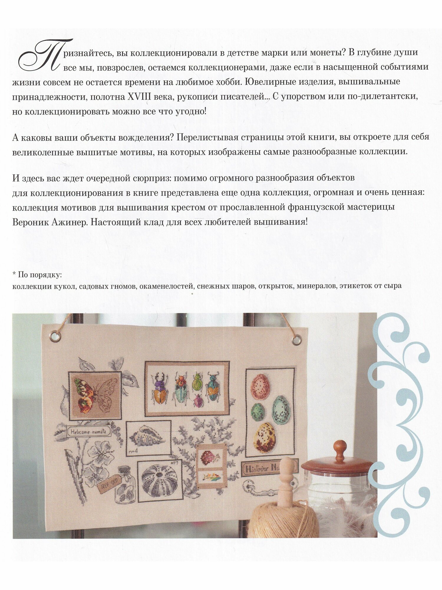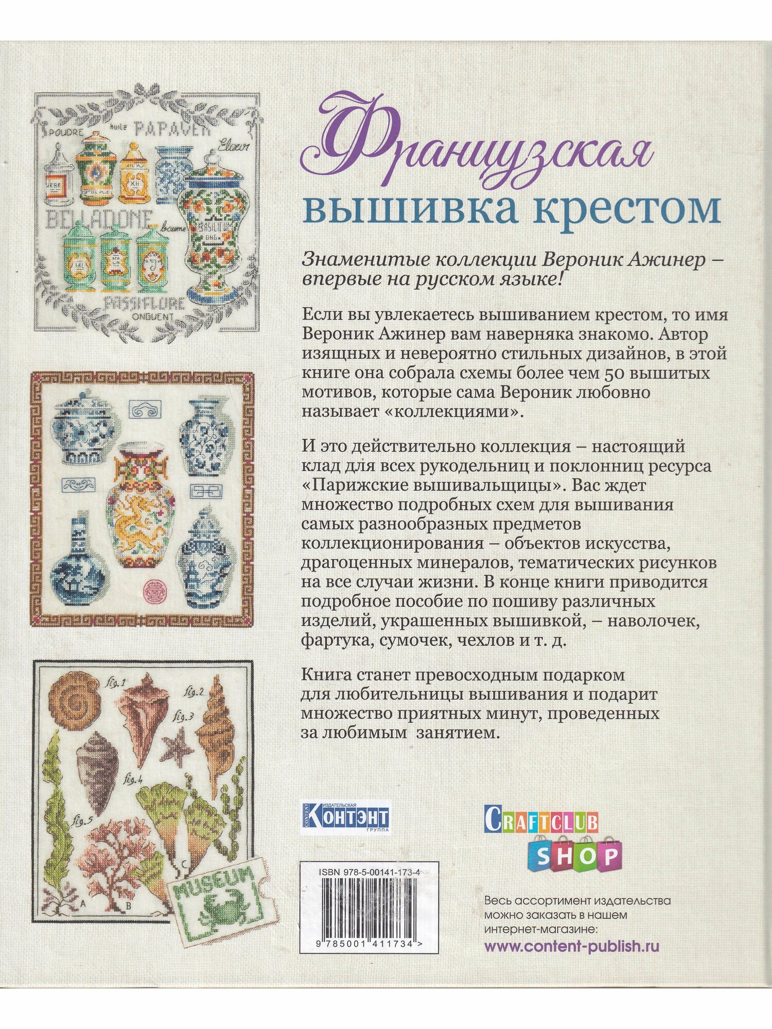 Знаменитые коллекции Вероник Ажинер – впервые на русском языке! Если вы увлекаетесь вышиванием крестом, то имя Вероник Ажинер вам наверняка знакомо. Автор изящных и невероятно стильных дизайнов, в этой книге она собрала схемы более чем 50 вышитых мотивов, которые сама Вероник любовно называет «коллекциями». И это действительно коллекция – настоящий клад для всех рукодельниц и поклонниц ресурса «Парижские вышивальщицы». Вас ждет множество подробных схем для вышивания самых разнообразных предметов коллекционирования – объектов искусства, драгоценных минералов, тематических рисунков на все случаи жизни. В конце книги приводится подробное пособие по пошиву различных изделий, украшенных вышивкой, – наволочек, фартука, сумочек, чехлов и т.д. Книга станет превосходным подарком для любительницы вышивания и подарит множество приятных минут, проведенных за любимым занятием.