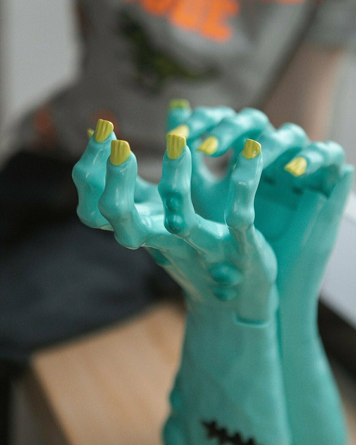 Рука зомби бирюзового цвета с яркими ногтями и шрамами. Верхняя рука механическая.