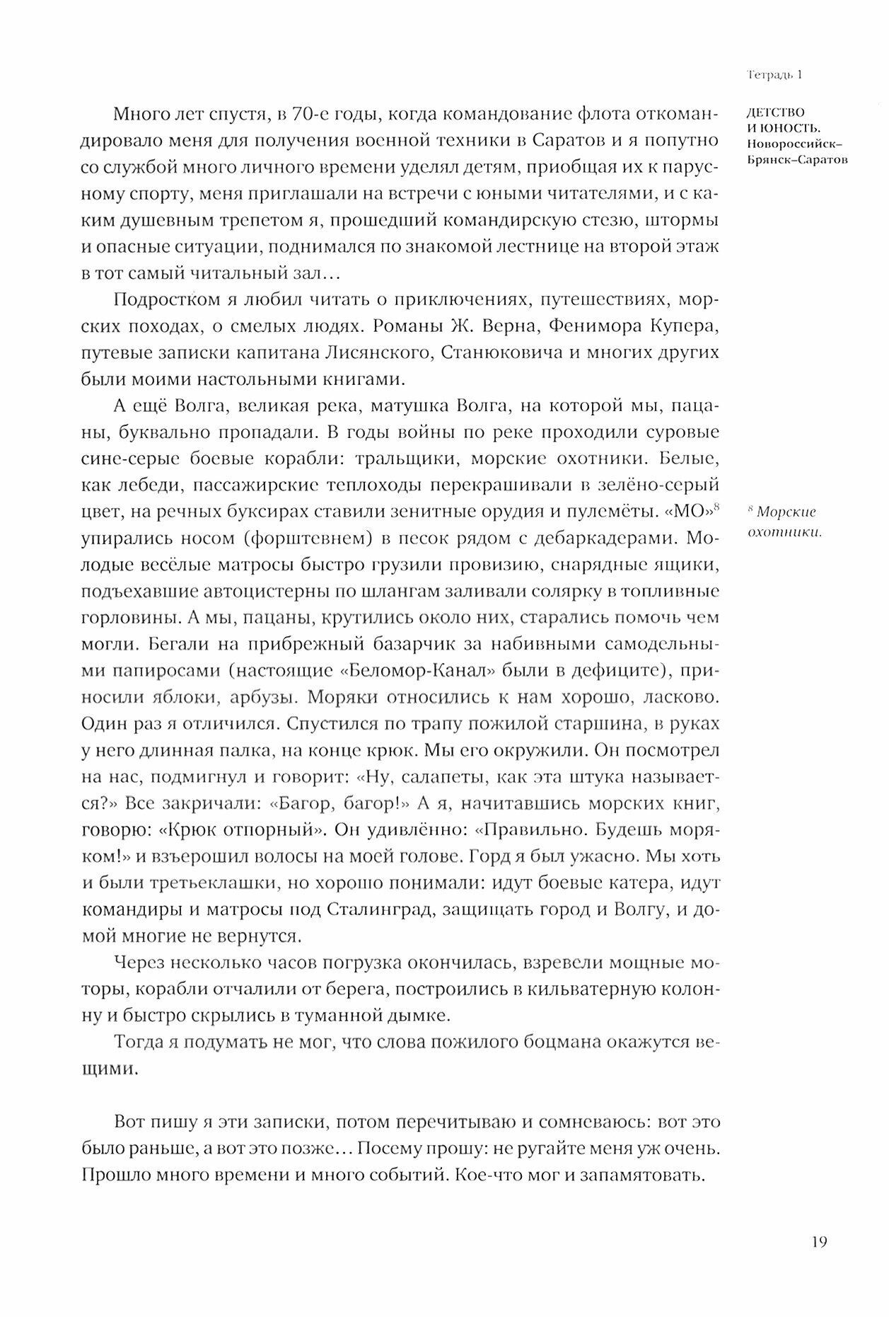 Не доводилось ранее писать рецензий... Начну с того что понравилось. Стиль литературно обработанный, либо автор неплохой писатель. Достаточно детальные диалоги, характеры сослуживцев и просто, с кем пересёк я автор прописаны правдиво, хотя некоторые более поверхностно и документально. Личная оценка даётся в "военной" манере, легко веришь стилю. Много фактов, много деталей. Неплохой отсыл в 50-60 годы, эпоха и люди переданы, на первый взгляд правдиво и через ощущение человека того времени, а не следующих поколений. Интересно описаны подробности службы, достаточно подробностей, терминов. Хотя человеку далёкому от предмета, может показаться суховато и излишне документально. Юмора и жульверщины здесь нет совсем. Кстати, здесь довольно мало и эпизодичеки про жизнь в семье, личные переживания и вообще личное. Отношение ко всему, через командирский подход. Автор этакий служака, готовый жить службой, коллективом, а остальное по остаточному принципу... Но, да, таких было много, типичный пласт людей той эпохи. Это добавляет достоверности, но чтение увлекательным не становится. Глава за главой, ожидаемое развитие событий, жгучее желание автора придерживаться порядка, чёткое отделение, где проходит грань командира, где подчинённого. При этом автор периодически утверждает, что его команда любила... Ну не знаю, уважала и гордилась, может. Но душевности, каких-то мелочей, человечности... Не проглядывается. Возможно, отсюда увлечение судовождением и парусом, стремление быть один на один с кораблём. А команда скорее помеха, которая требует обучения, внимания и за неё ещё и ответственность нести... Пару раз я книгу откладывал, становилось предсказуемо и скучно. Но это документальный труд, мемуары человека и командира той эпохи. Но как любят писать в интернете - тема не раскрыта. При этом, заканчивается достаточно резко. Путь от инженера каплея не описан. Просто обрывается. Как получено первое капитанское звание, зачем и что это дало или чего стоило не ясно. Но автор ко всему II ранга. Почему, книга закончена на каплее... Будет продолжение, а вряд ли... В целом, я получил, что хотел. Оформление книги хорошее, бумага и печать существенно выше средней. Но обложка отвалилась по корешку сзади. Книга тяжёлая, а склейка на это оказалась не рассчитана.. Но тетради не рассыпались. Восстановить без проблем. Спасибо, писал через телефон, абзацы не ставил...