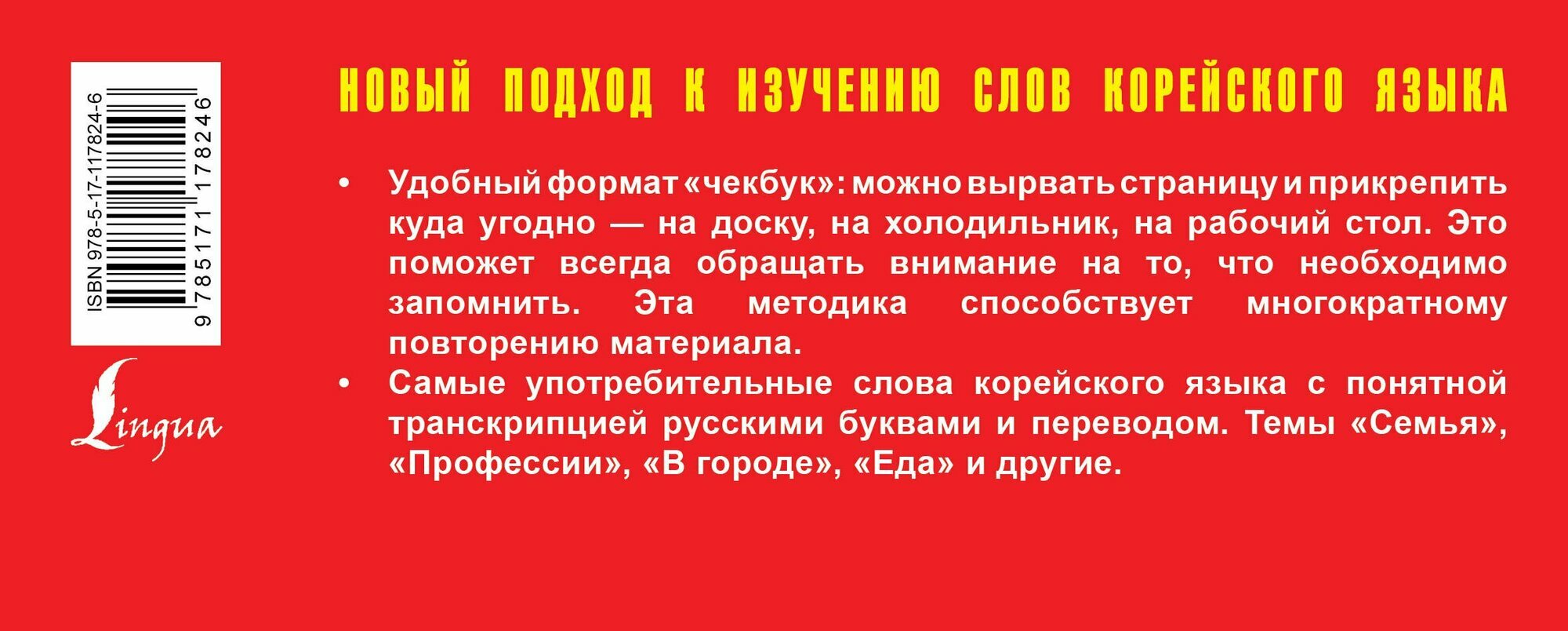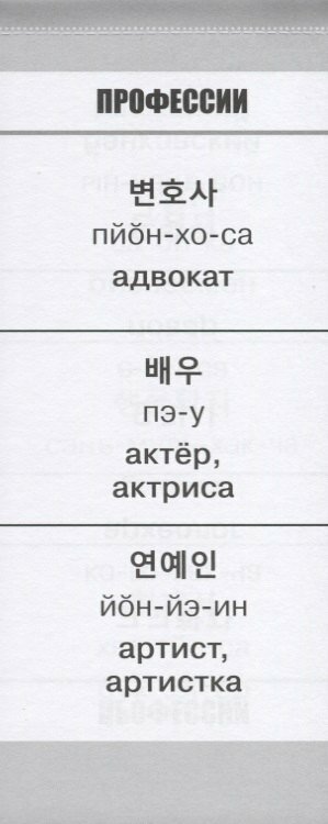 В пособии даны самые употребительные слова корейского языка с понятной транскрипцией русскими буквами и переводом. Темы "Семья", "Профессии", "В городе", "Еда" и другие. Удобный формат "чекбук": можно вырвать страницу и прикрепить куда угодно - на доску, на холодильник, на рабочий стол. Это поможет всегда обращать внимание на то, что необходимо запомнить. Эта методика способствует многократному повторению материала.