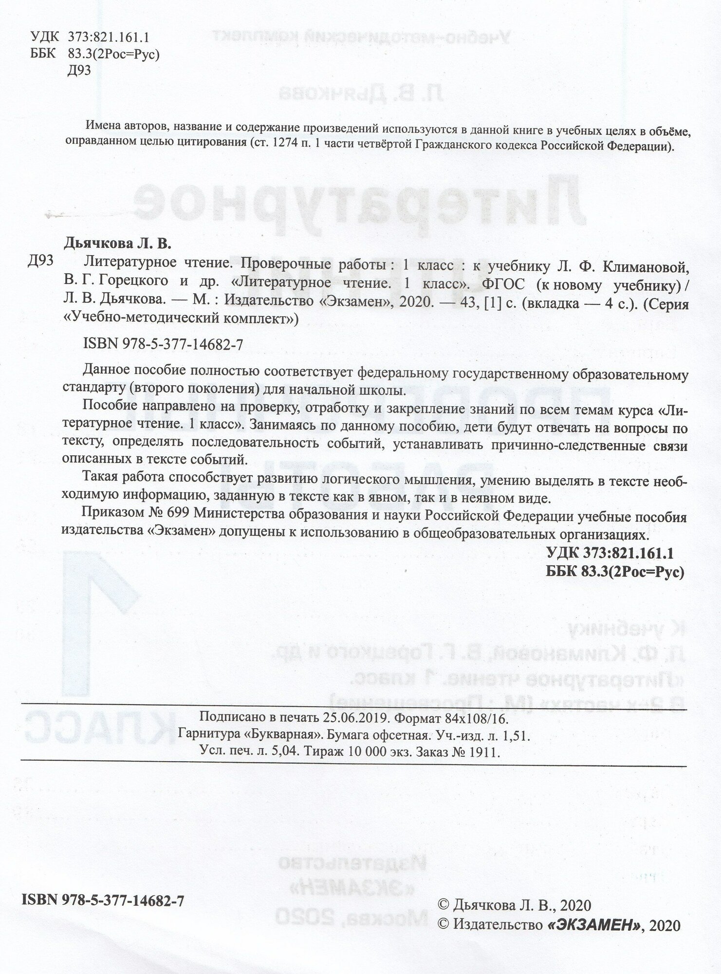 Литературное чтение. 1 класс. Проверочные работы. К учебнику Л. Ф. Климановой В. Г. Горецкого и др. (Дьячкова Лариса Вячеславовна); Экзамен, 2020