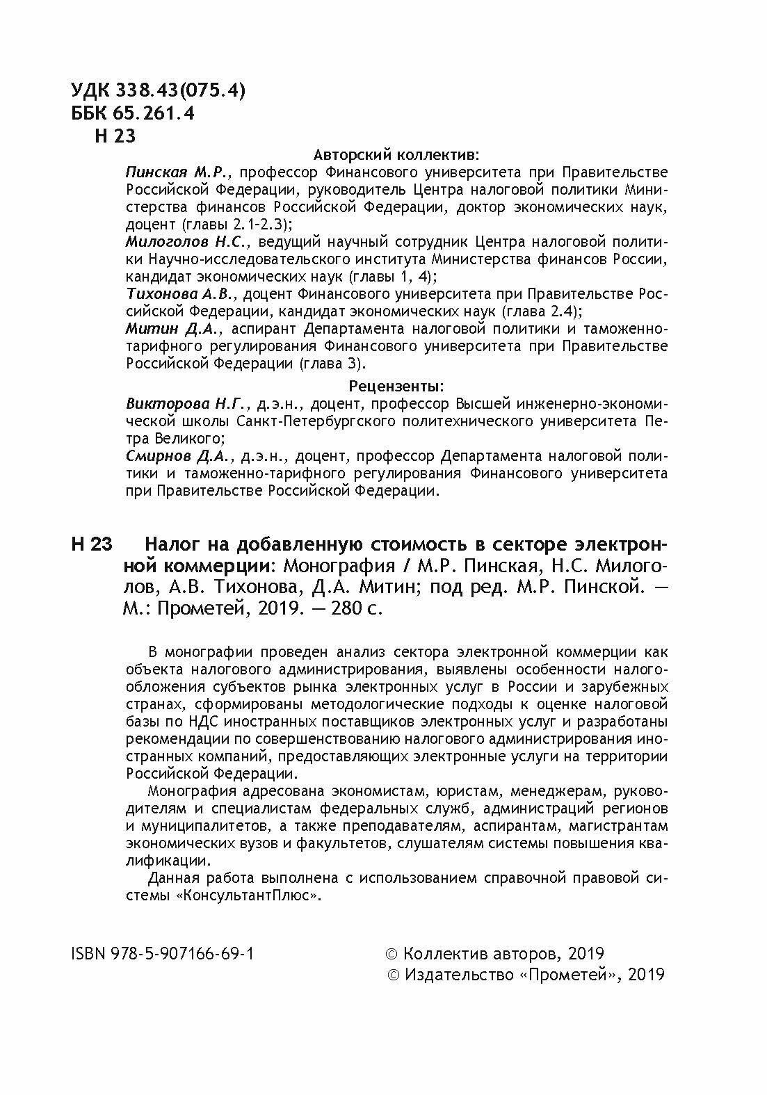 Сервис сравнения цен СкидкаГИД предлагает сравнить цены на товар «Книга: Налог на добавленную стоимость в секторе электронной коммерции (Пинская Миляуша Рашитовна, Тихонова Анна Витальевна, Милоголов Николай Сергеевич); Прометей, 2019»