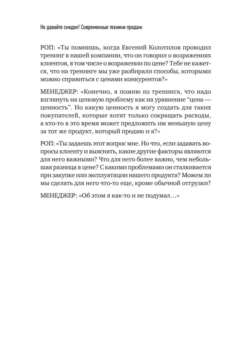 В книге известного бизнес-тренера Евгения Колотилова предлагается принципиально другой подход к процессу продажи, основанный не на снижении цены, а на создании для клиентов добавленной ценности.