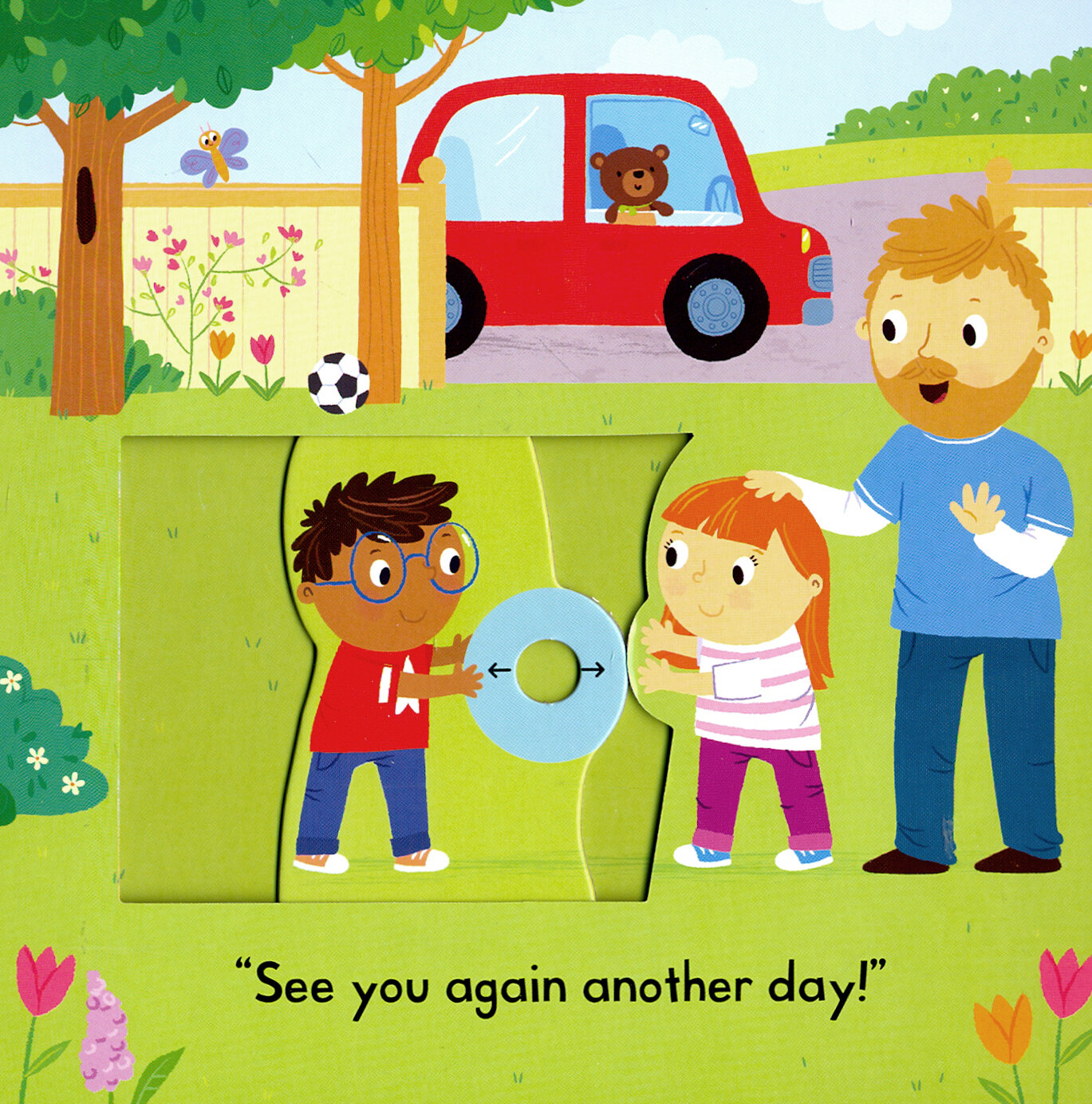 Push and pull the tabs and turn the wheel In Busy Friends. Children will love seeing two best friends share their toys, swap treats, play in the park and give each other a big hug!