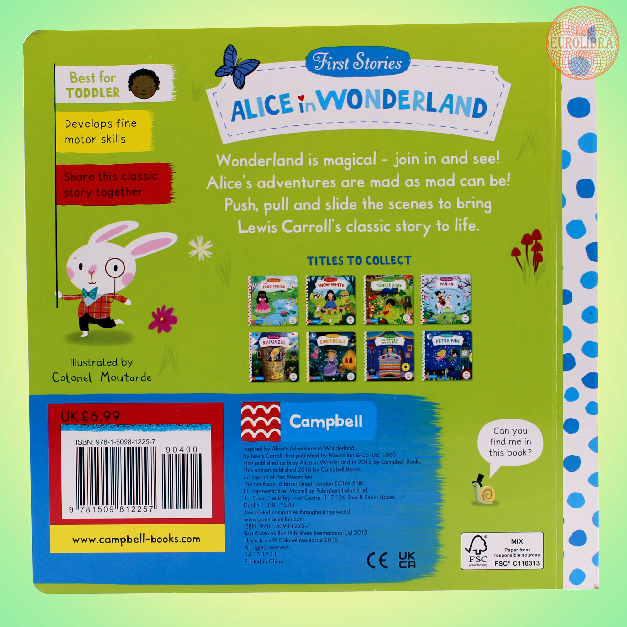 First Stories: Alice in Wonderland is a perfect introduction, for young children, to Lewis Carroll's magical story Alice in Wonderland. Push, pull and turn mechanisms bring the story to life and introduce all the main characters, Alice, the White Rabbit, the March Hare, Mad Hatter, Dormouse and of course the Queen of Hearts. Beautifully brought to life by Colonel Moutarde's illustrations.
