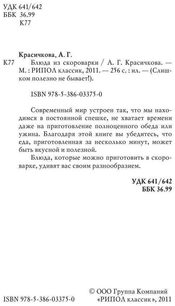 Я немного промахнулась,т.к. думала,что книга для автоматической скороварки.К рисунку на обложке особенно не присматривалась. Но не впечатлила меня книга по другому поводу. Огромное количество рецептов первых блюд,некоторые из которых никогда готовить не будешь.А так рецепты:первое,второе и каши. Рецепты очень сжаты по информации,рассчитаны скорее на опытную хозяйку. Да и качество бумаги не на высоте.
