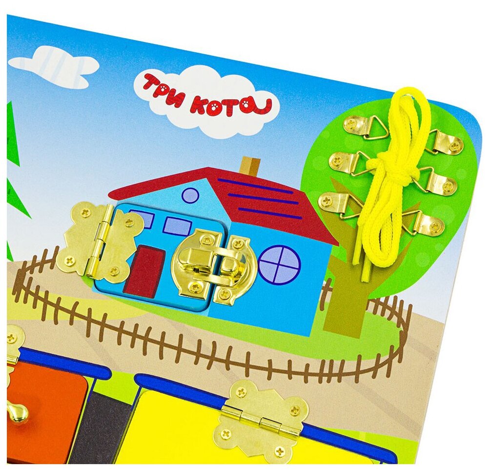 Бизиборд «Три кота» определенно понравится Вашему малышу, ведь он создан по мотивам одноименного мультсериала. Ребенку понравится разглядывать веселые иллюстрации и взаимодействовать с развивающими элементами. Бизиборд оснащен шнуровкой, шестеренками, которые можно крутить, открывающимися дверцами и окошками, защелками и лабиринтом с бусинами. Играя с бизибордом, малыш развивает мелкую моторику, логику, тактильные ощущения, цветовосприятие и воображение. Изделие выполнено из качественных и безопасных материалов.