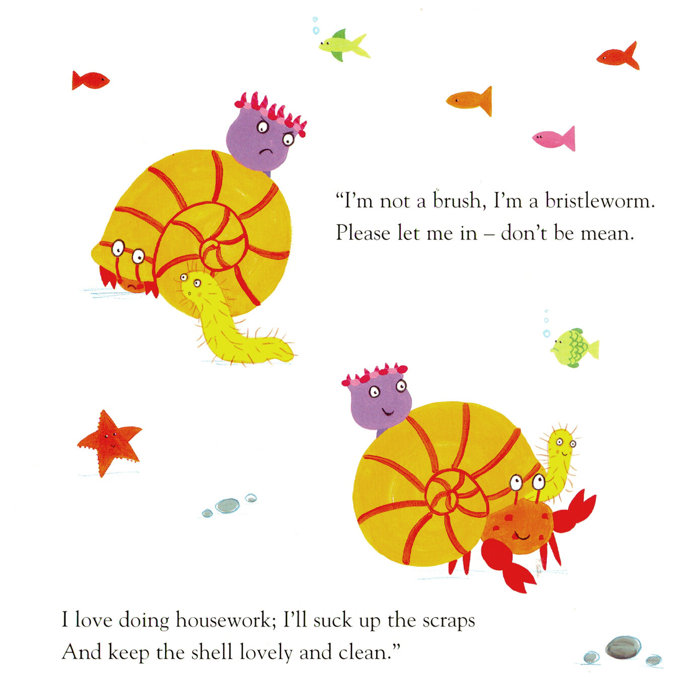 When Crab finds a new shell, he doesn't want to share it with anyone - especially not a blobby purple anemone and a tickly bristleworm. But life in the rock pool proves tougher than Crab thinks and he soon finds he needs his new housemates.