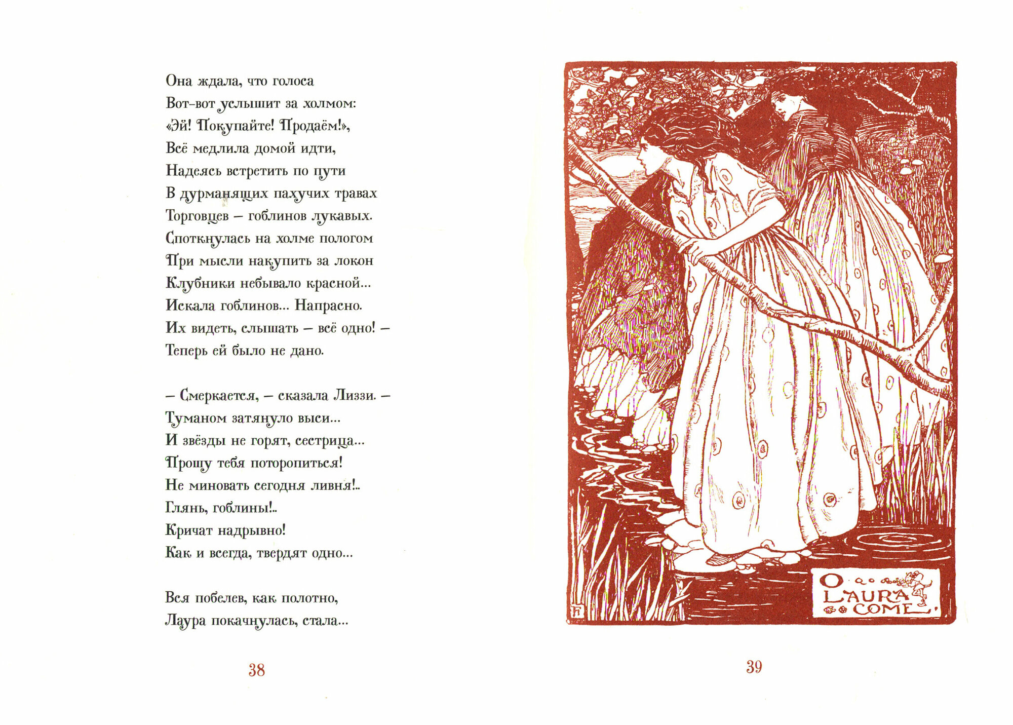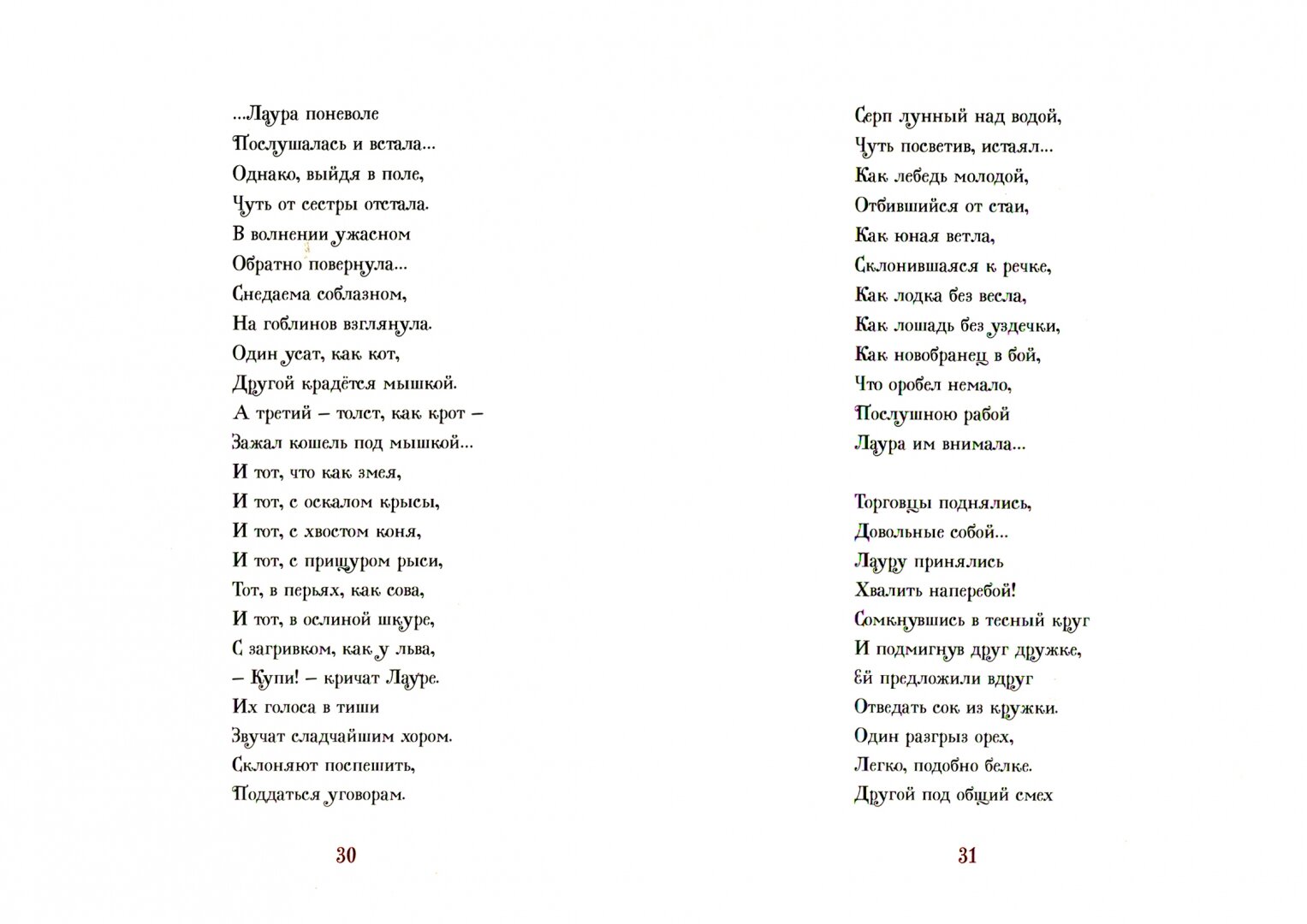 Может, помимо хорошего языка, именно удачно найденный фольклорный слог надолго сохраняет в твоем внутреннем взоре испытующих гоблинов с их совращающими коварными блаженствами, позволяет примеривать на себя то Лиззи, то Лауру, а через них и размышлять о том, что же во всей нашей жизни ценно, что обманчиво, что мимолетно, что лишает свободы, что – высота духа, что прочно и незыблемо.